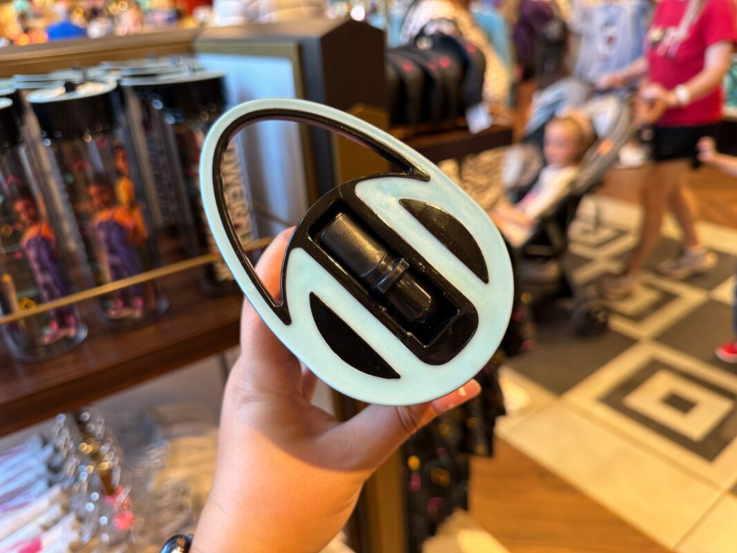 The cap has a built-in flip-up straw. It’s black with a blue-white design. You can also find it at the Disney Store.