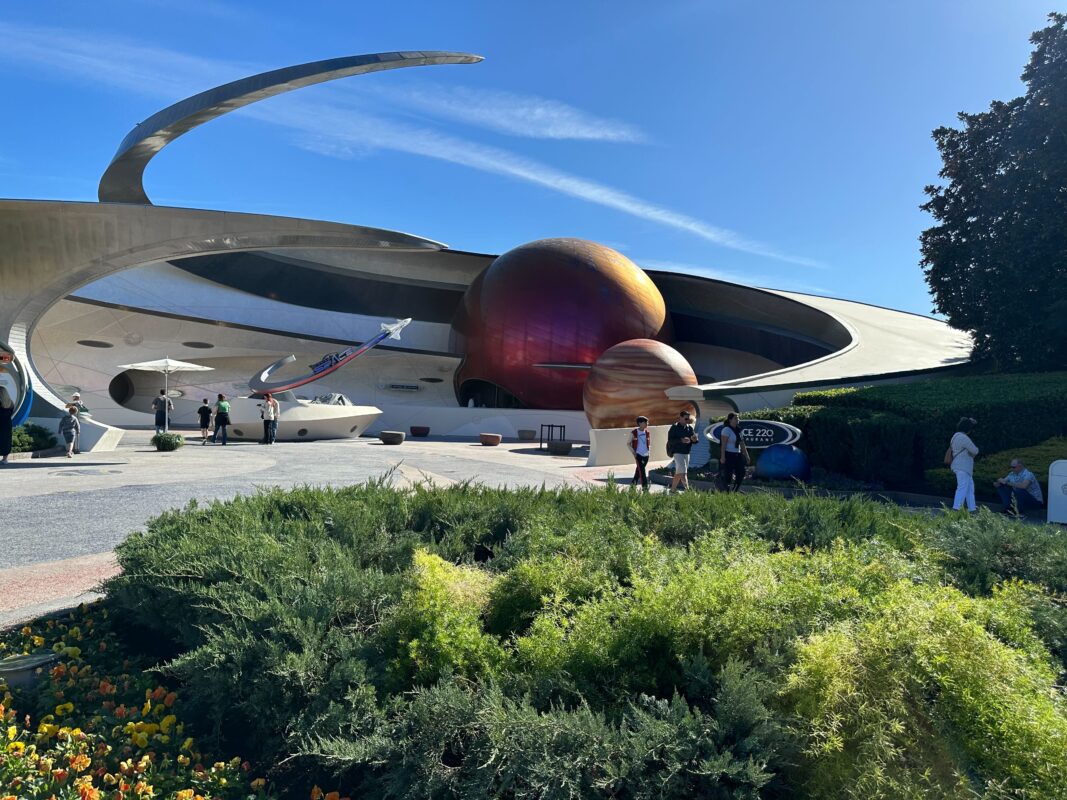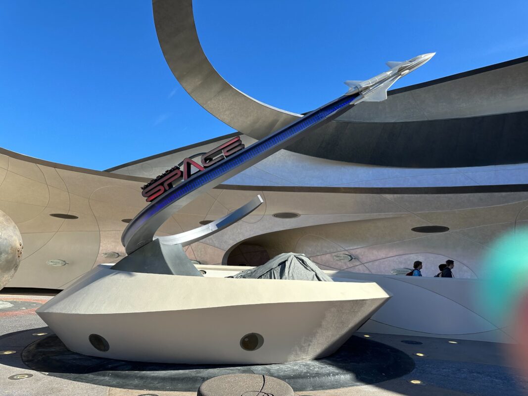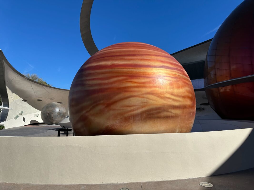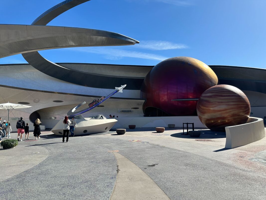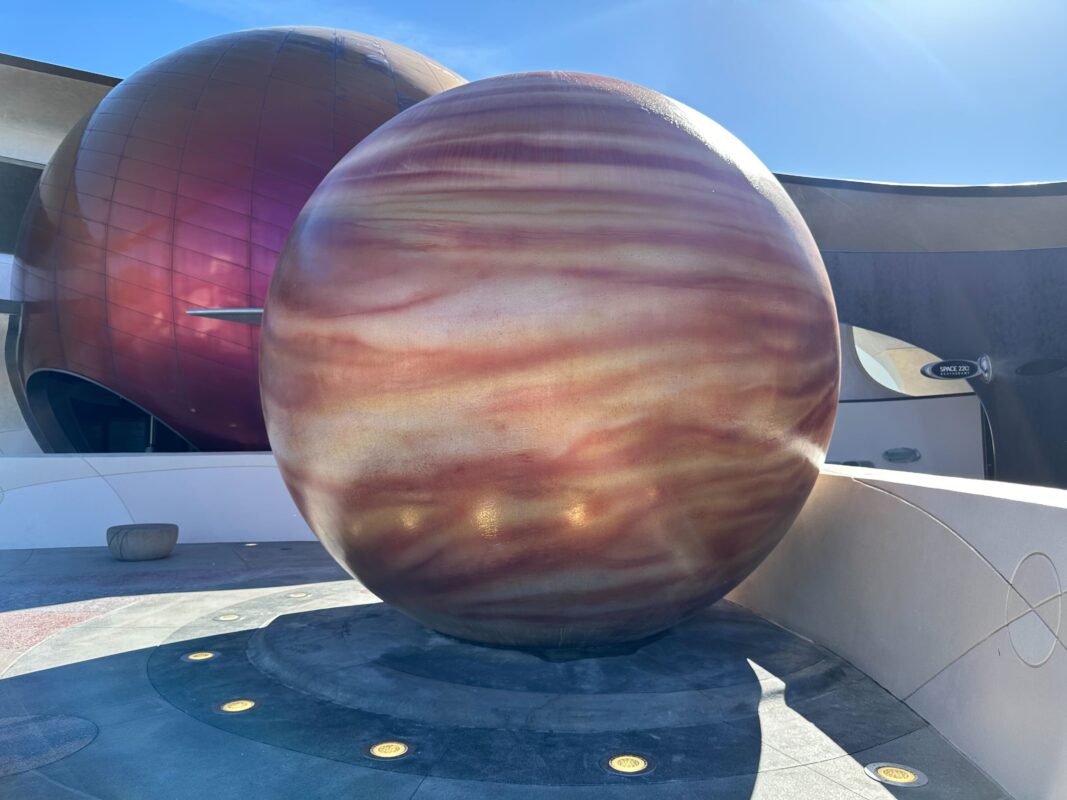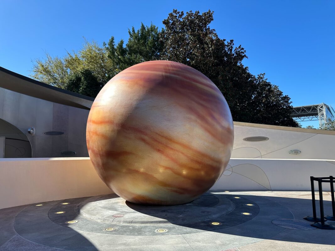 Refurbishment on the exterior of Mission: SPACE at EPCOT continues, as scrim has come down from around the planet Jupiter just in front of the ride’s entrance.