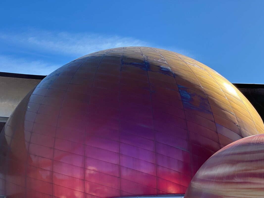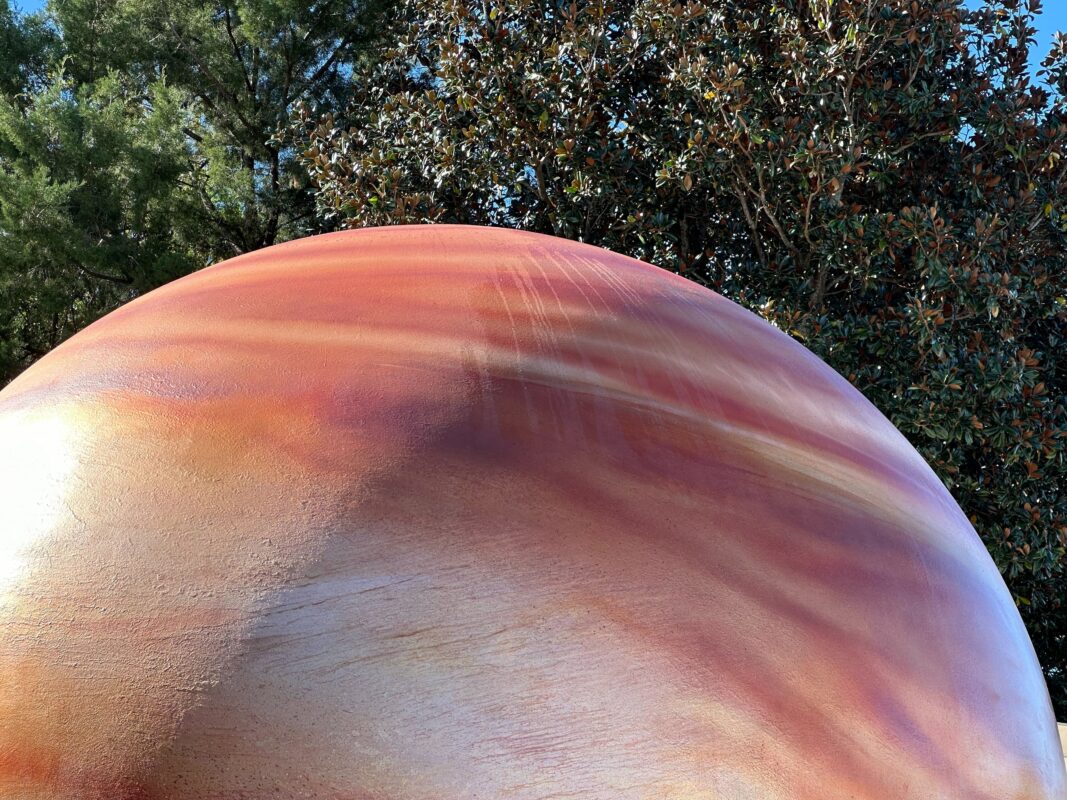 While the sun highlights the texture of the planet, we also spotted some faint paint drip lines along the top, pointed more toward the inside of Planetary Plaza.