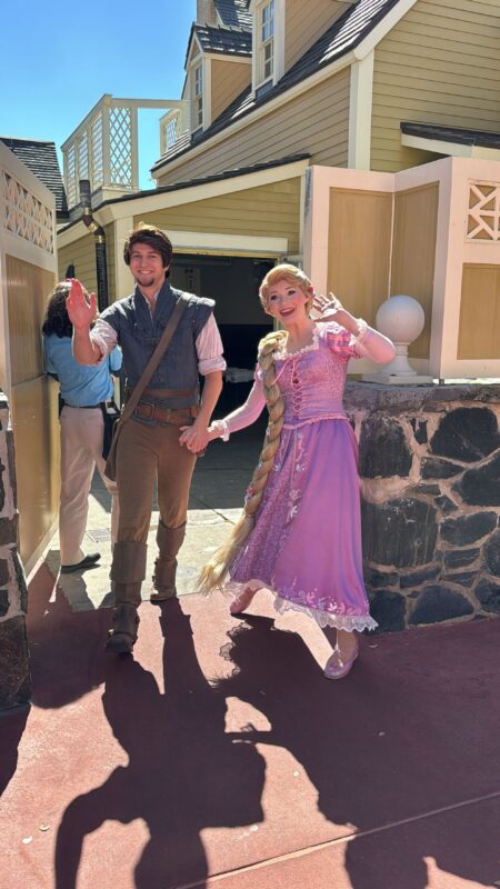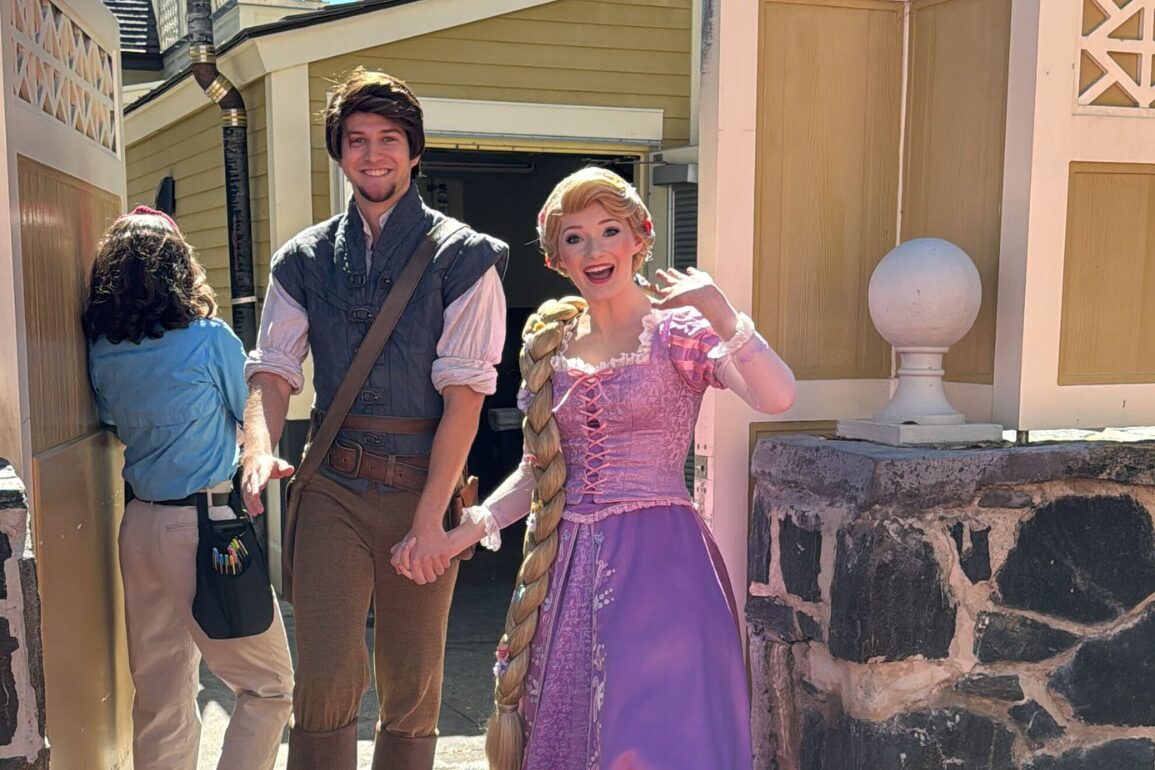 Rapunzel and Flynn Rider walk toward their meet and greet area holding hands.