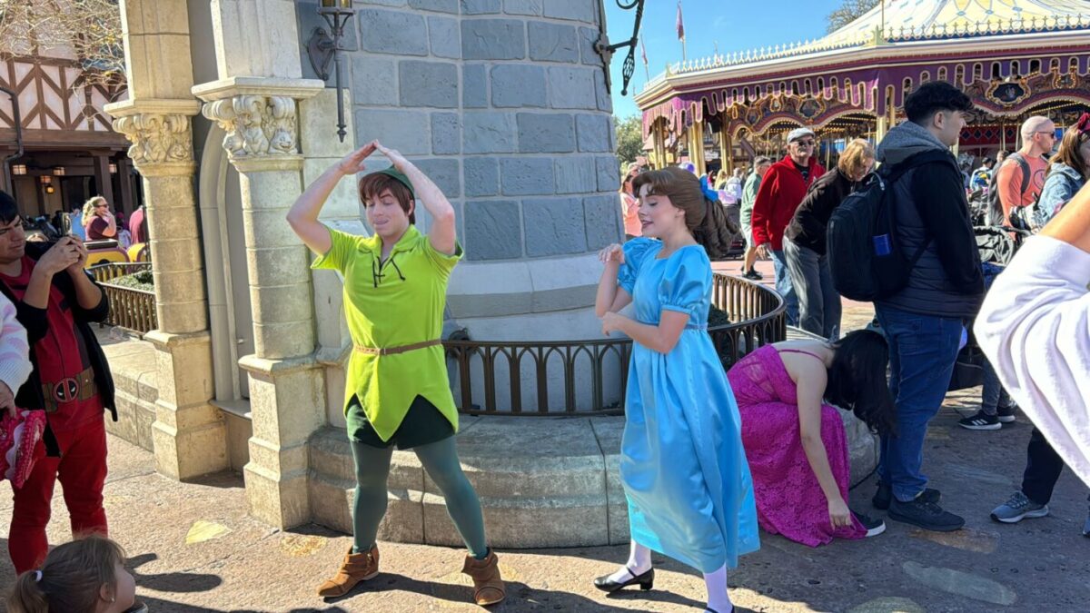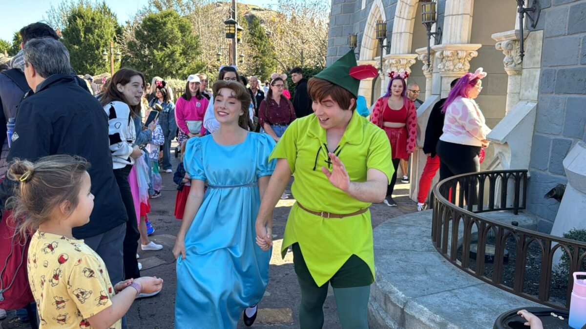 Peter Pan and Wendy roam Fantasyland hand in hand, waving to guests as they pass by.