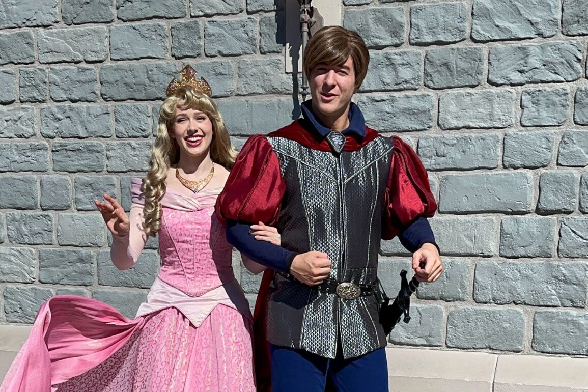 Princess Aurora and Prince Phillip say hello to guests in Fantasyland.