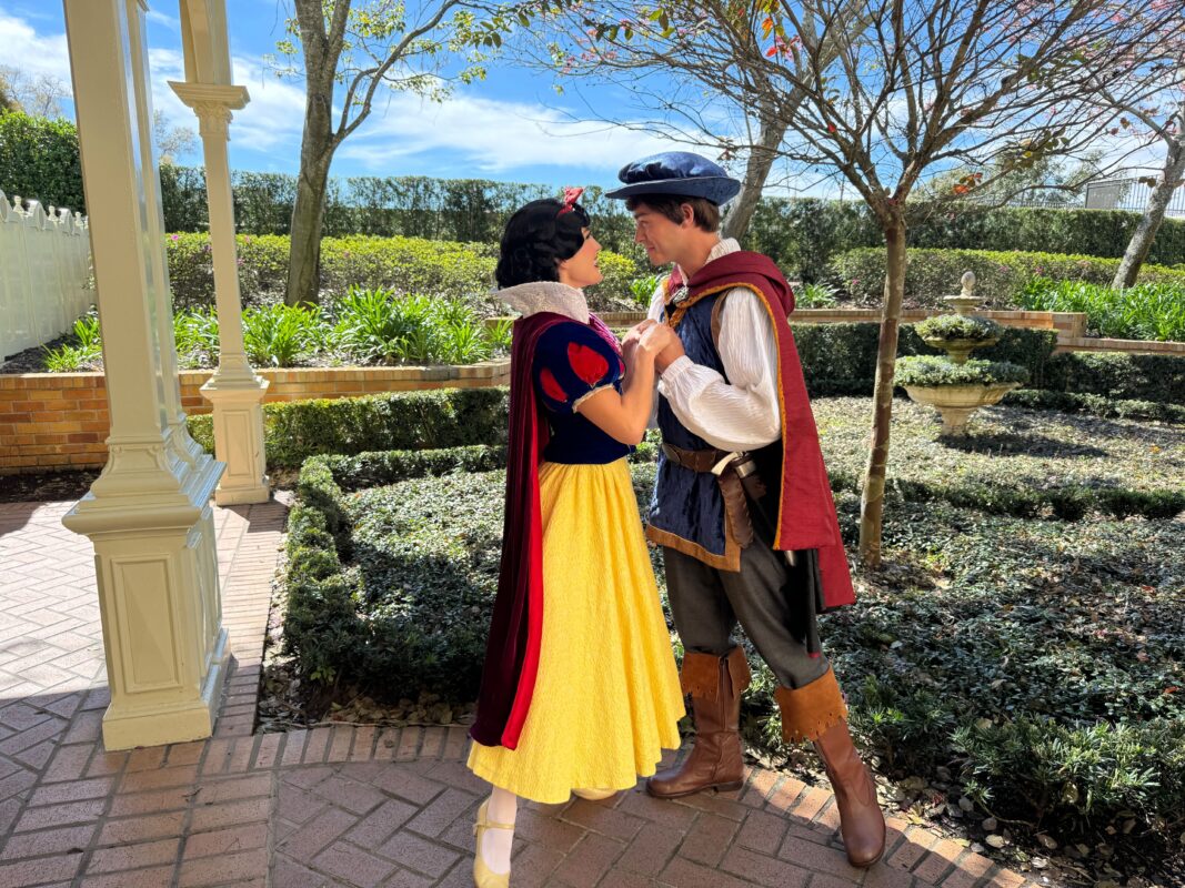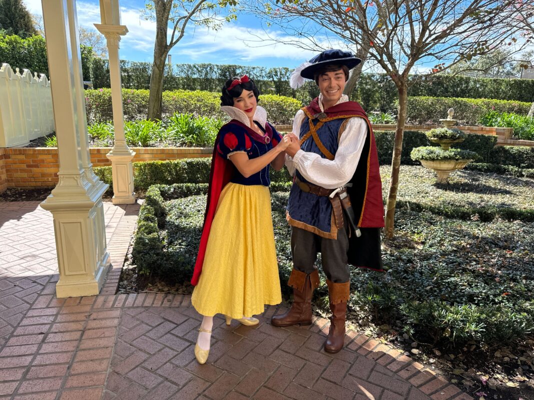Snow White and Prince Florian were meeting guests on Main Street, U.S.A., outside near the Town Square Theater.
