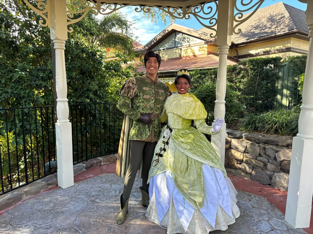 Princess Tiana and Prince Naveen can be found today in the Enchanted Glade Gazebo in Liberty Square, behind Ye Olde Christmas Shoppe.