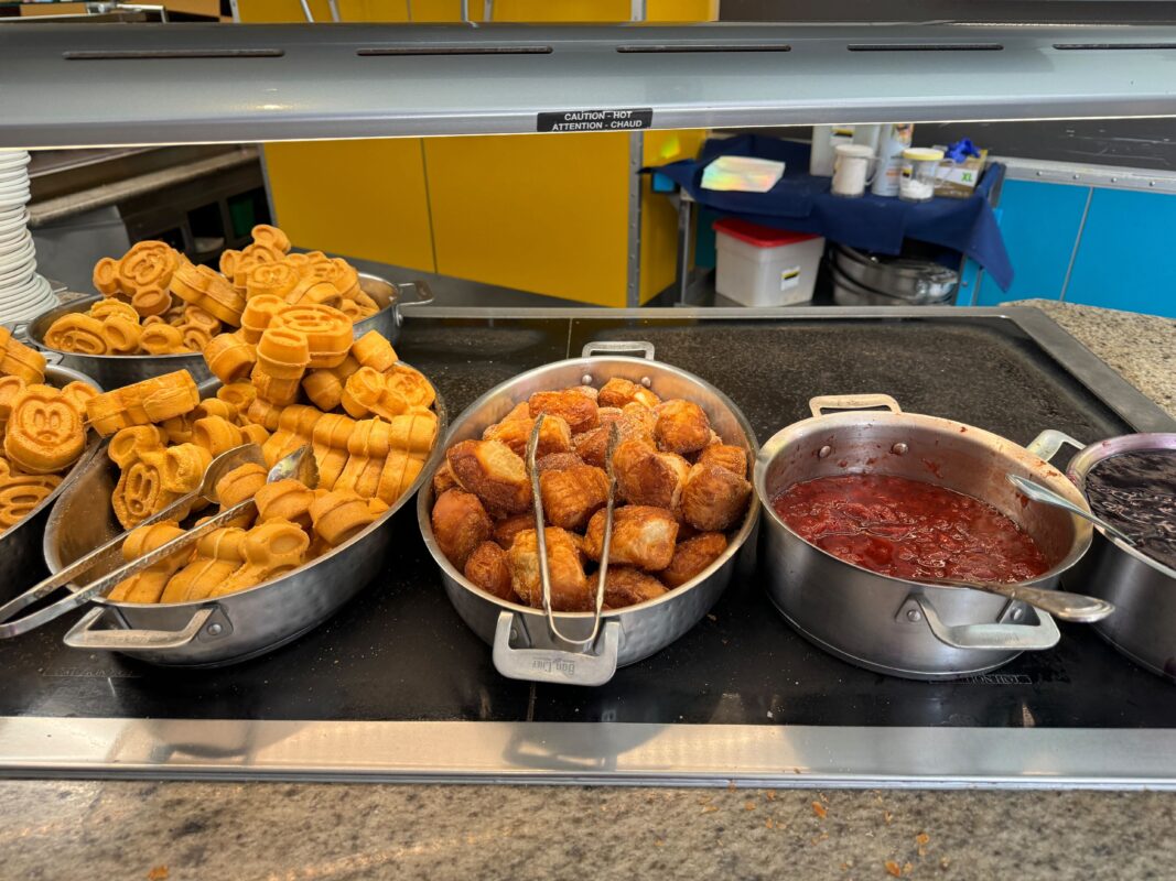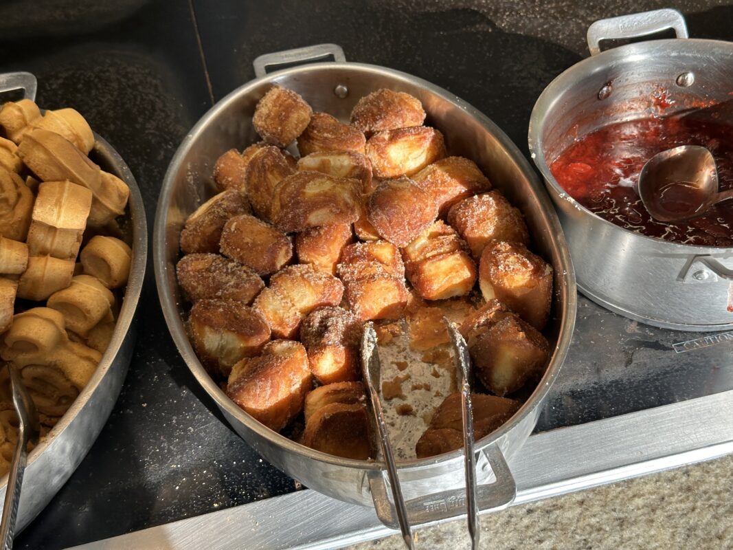 They’re soft, flaky, and buttery with the right amount of cinnamon sugar. The outside is crisp while the inside is doughy (without being too much so). It’s not overly sweet. There is strawberry sauce and blueberry sauce at this station, but we wouldn’t add anything to these, they’re perfect as-is.