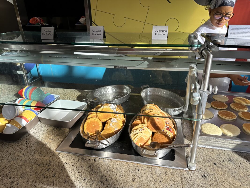 In addition to the “celebration pancakes,” there are new “seasonal pancakes.” Even though we were visiting Chef Mickey’s well past the new year, the seasonal pancakes were pumpkin-flavored, which seemed more like a fall flavor than winter.