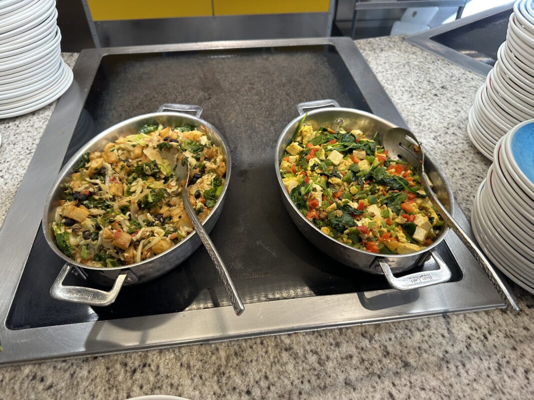 Tofu scramble (right) is returning but a plant-based hash (left) has replaced the frittata. Ingredients for the hash were not listed but it appeared to include potatoes, kale, lettuce, and tomato. We may not be the audience for this dish, but it was weird. We didn’t like the hot lettuce and hot kale. We would have leaned more into potatoes. There’s nothing wrong with the individual ingredients, it’s that it’s like a hot salad.