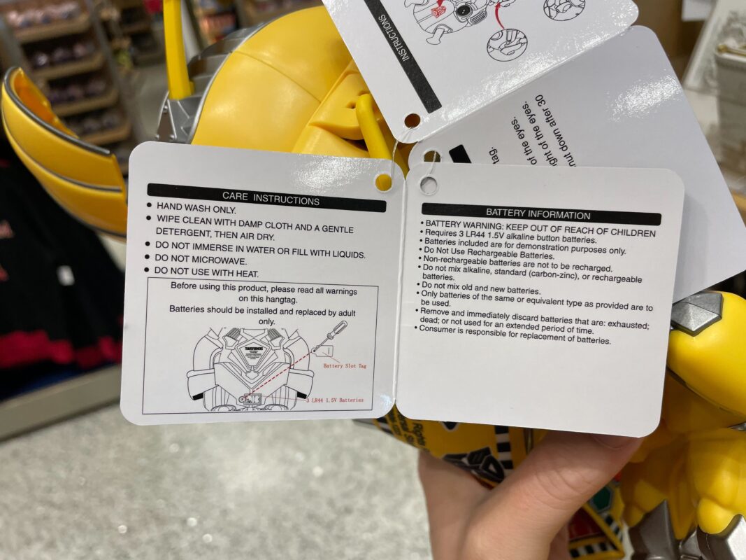 The tag notes that the Bumblebee popcorn bucket has small parts and is not suitable for children under 3 years. It has small button batteries that are hazardous if swallowed.