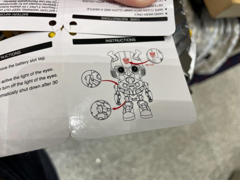 There are also instructions for how to operate the Bumblebee popcorn bucket. He has movable joints in his arms and legs. The Autobots logo on his forehead is a button that activates his light-up eyes.