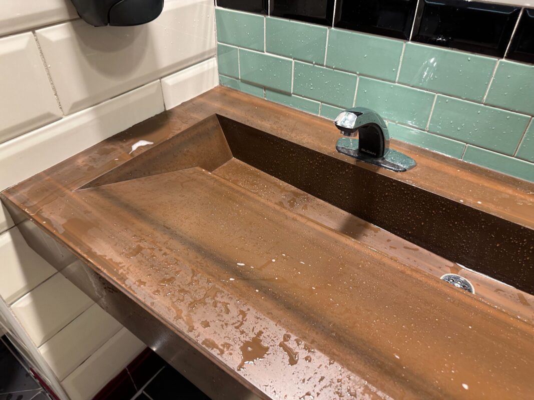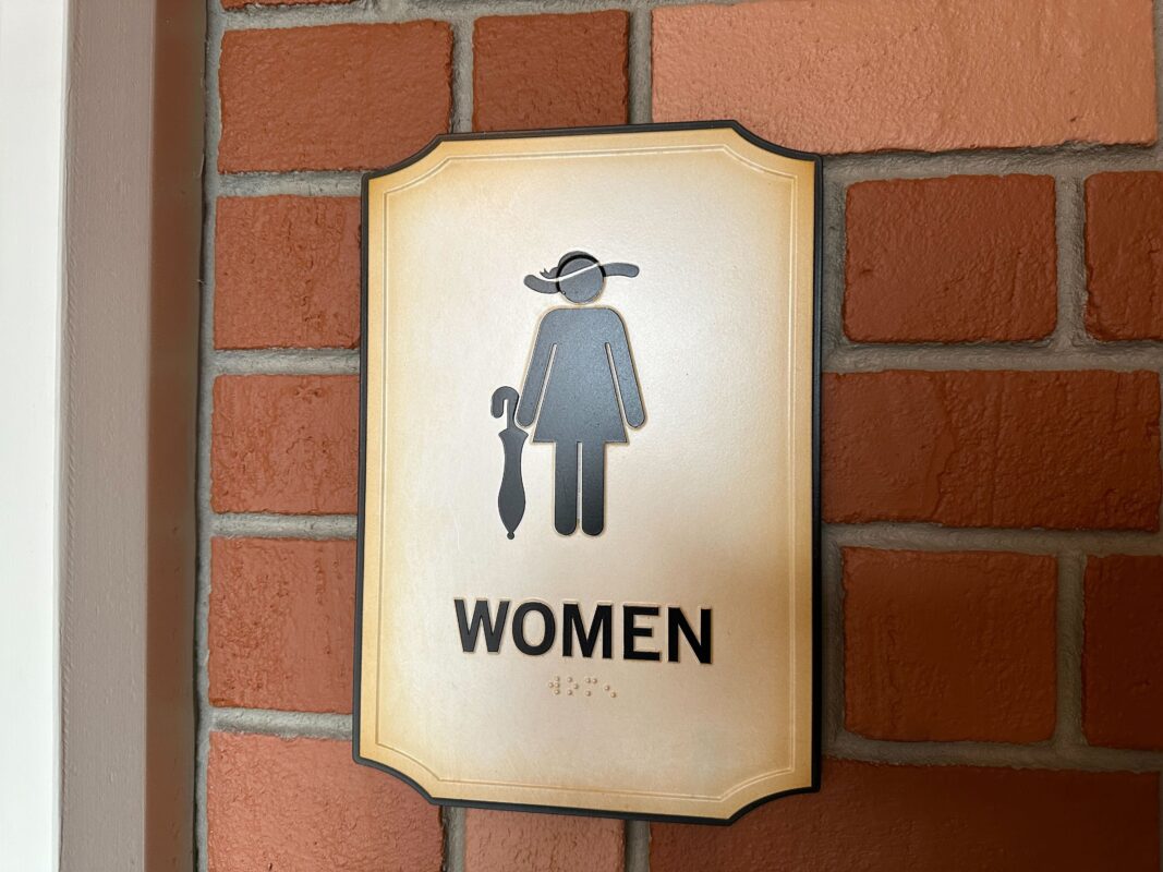 During our visit, we were able to take a look at the changes in the women’s restroom, which begin with a sign featuring a woman wearing a large hat and holding an umbrella.