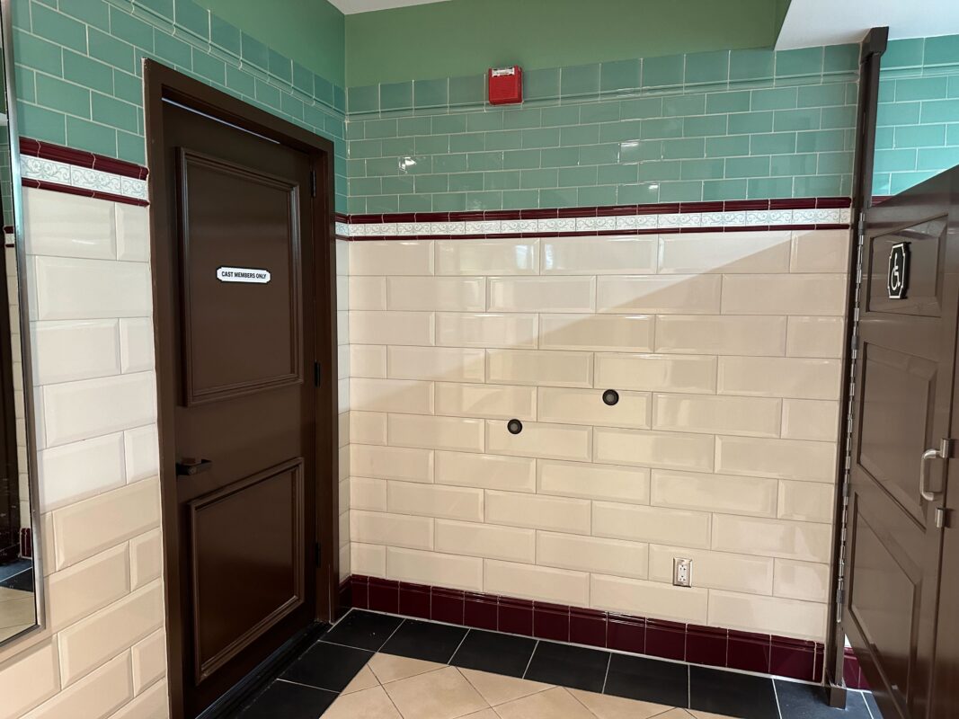 The interior has been completely remodeled and now sports a mint, brown, white, black, and off-white color scheme throughout, instilling a more English look. Prior to the refurbishment, these restrooms looked the same as they did in 1982.