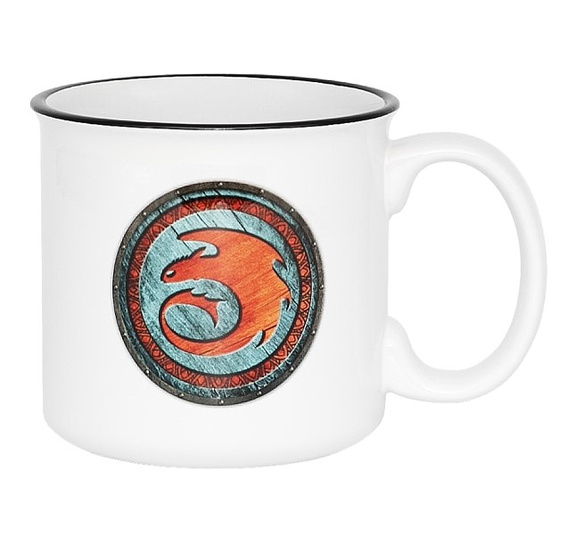 This 14-ounce ceramic mug is white with a shield-style logo for How to Train your Dragon – Isle of Berk on the front. It is microwave- and dishwasher-safe.