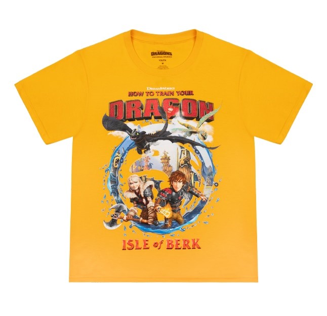 This youth T-shirt is a bright ochre color, and features art of Hiccup, Toothless, Astrid, and Stormfly from the “How to Train Your Dragon” films, along with “Isle of Berk” at the bottom.