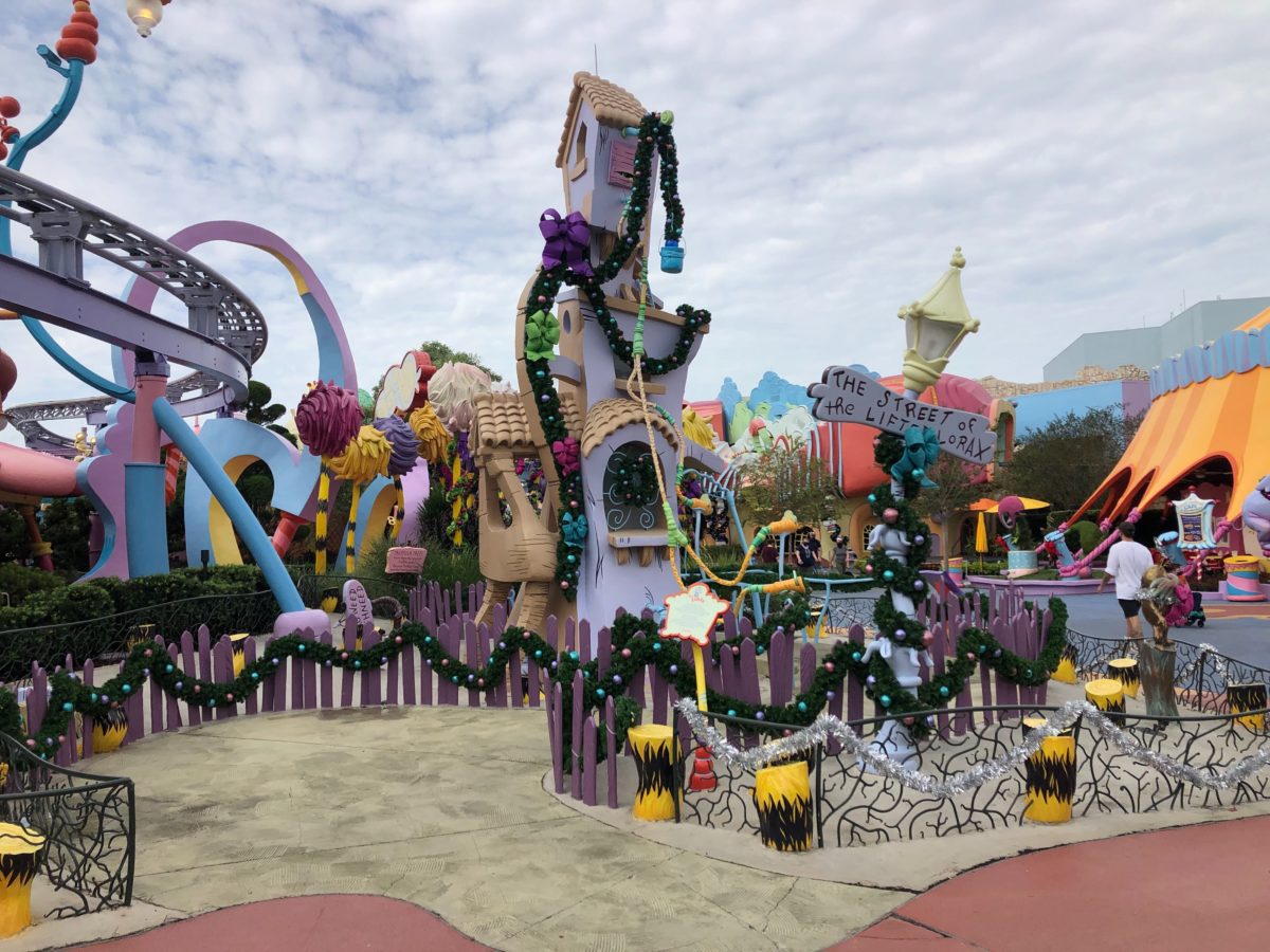 Pink construction walls surround the small play area. The Lorax’s tall purple house is visible over the walls. Its design is straight out of Dr. Seuss’ 1971 book.