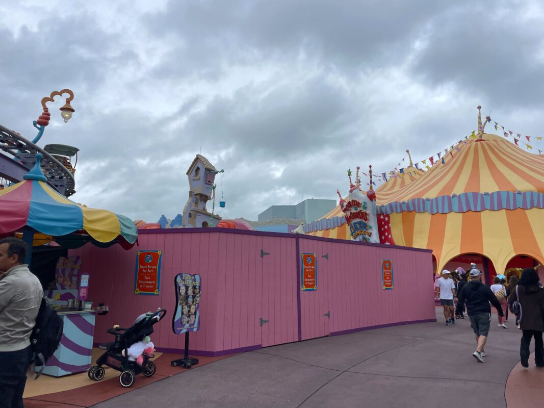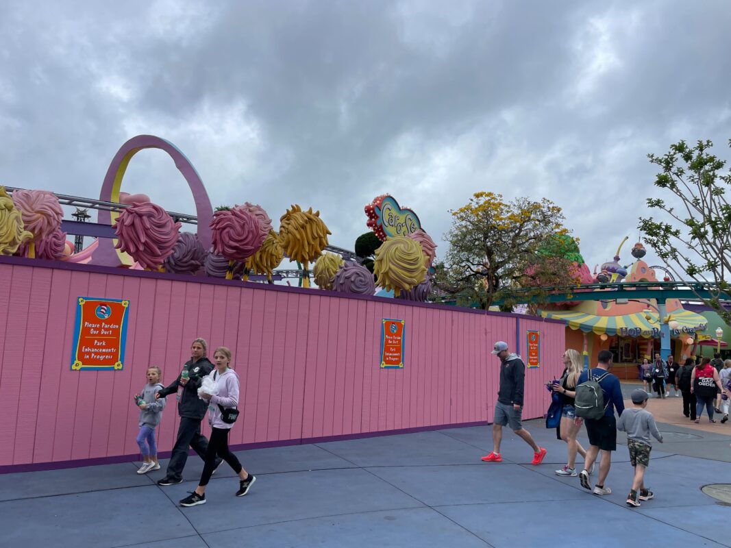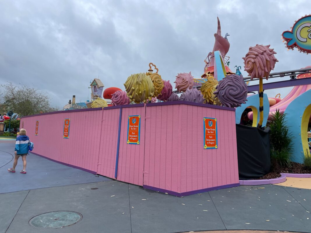 The colorful Truffula Trees also peek out over the construction walls. The Lorax’s house and the trees are next to the Caro-Seuss-el entrance.