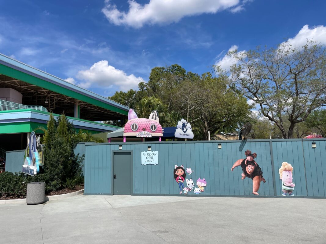 Over the construction walls near the main DreamWorks Land sign, guests can now view another DreamWorks sign and a Gabby’s Dollhouse sign, which peeks over the walls where Gabby and her friends are pictured.
