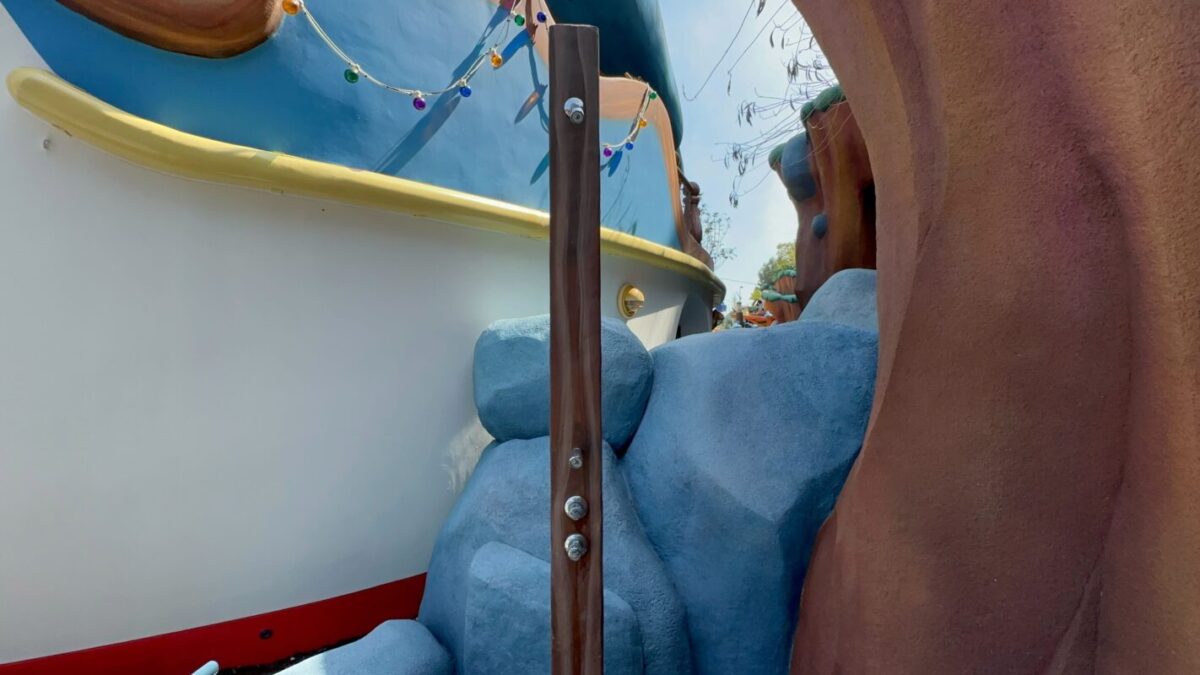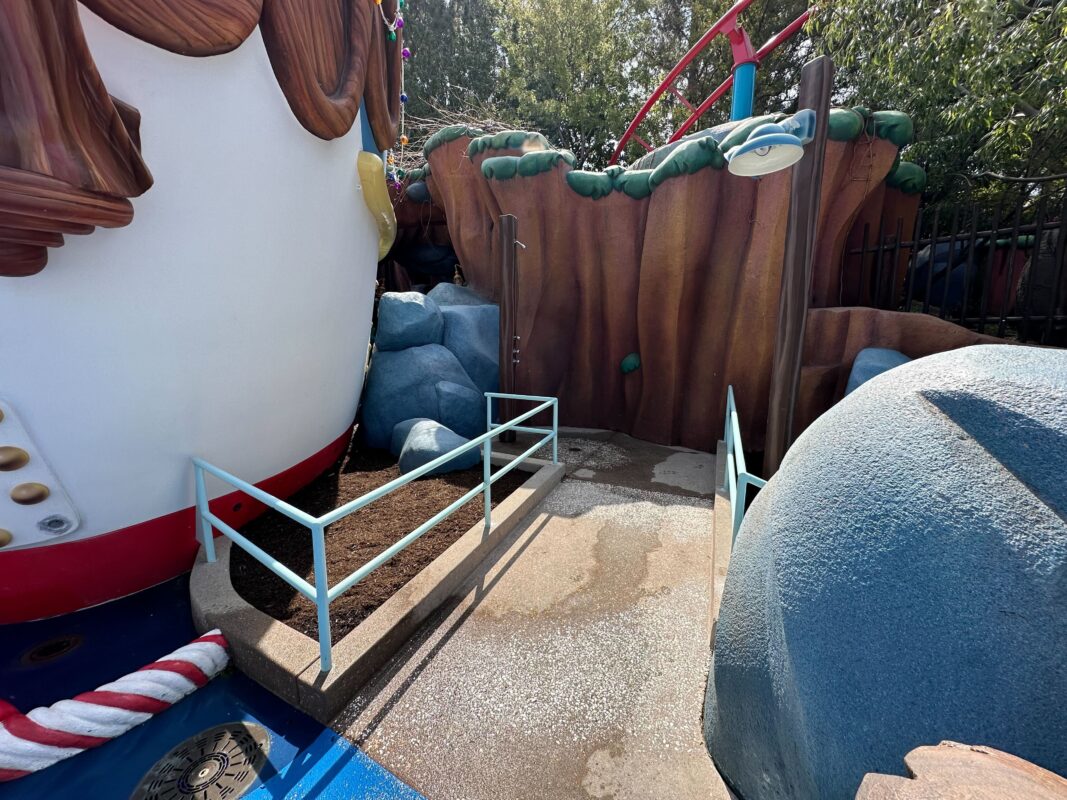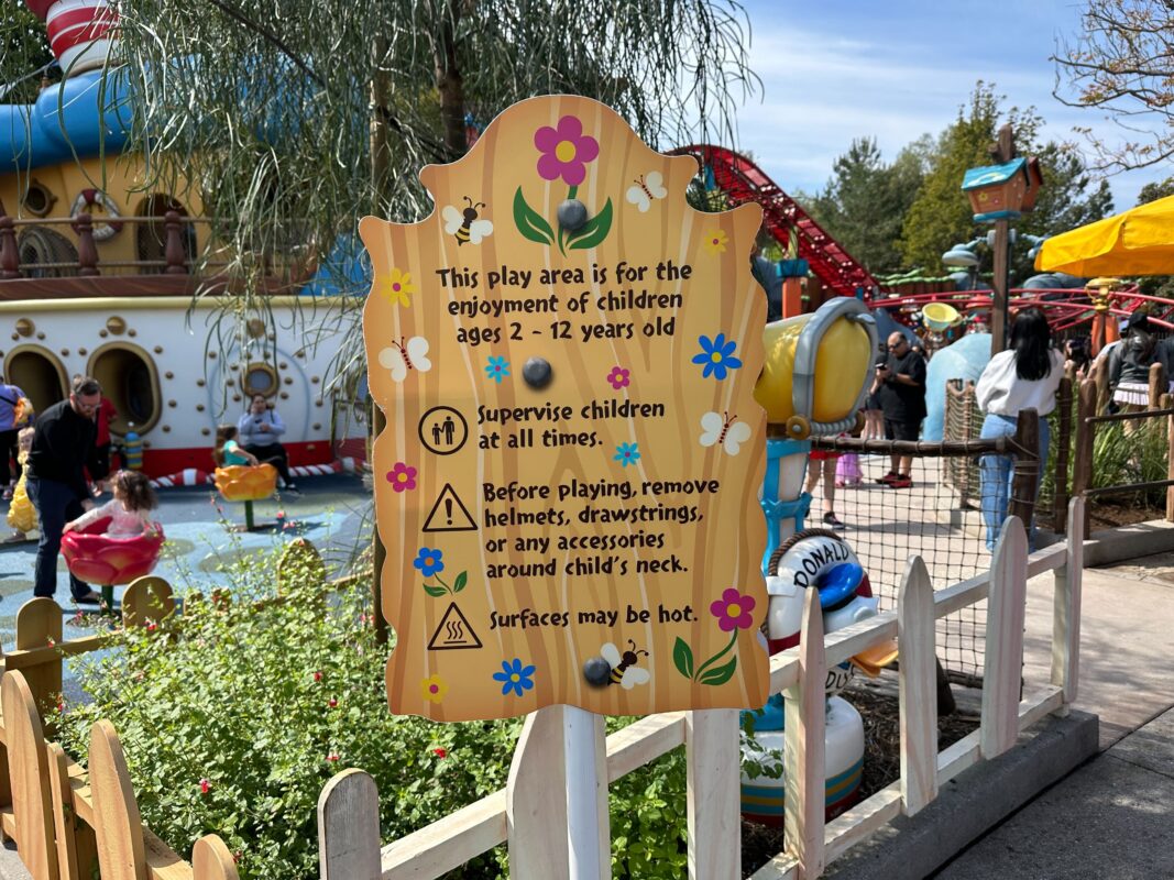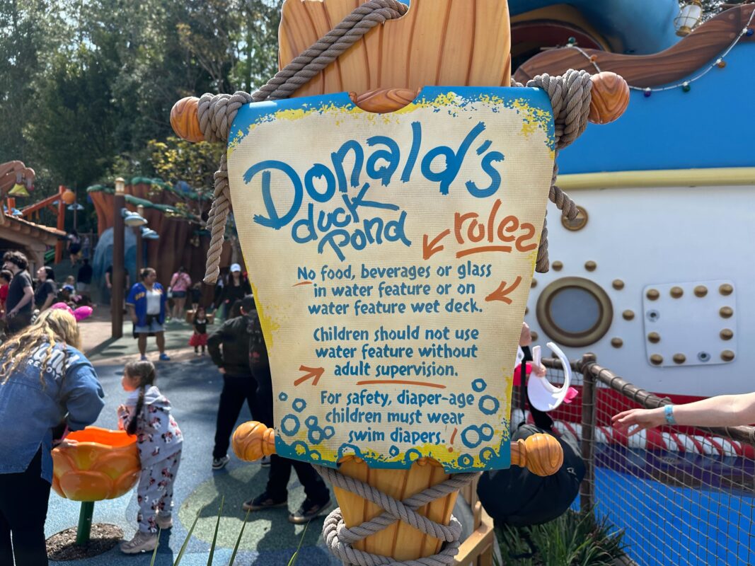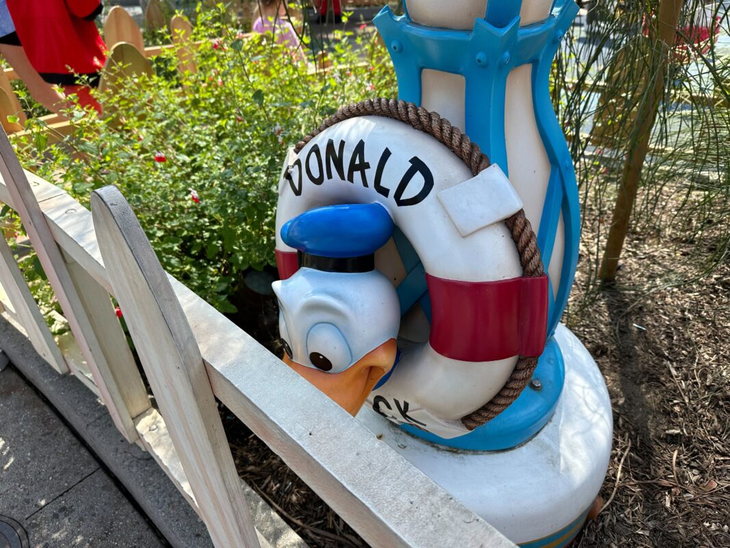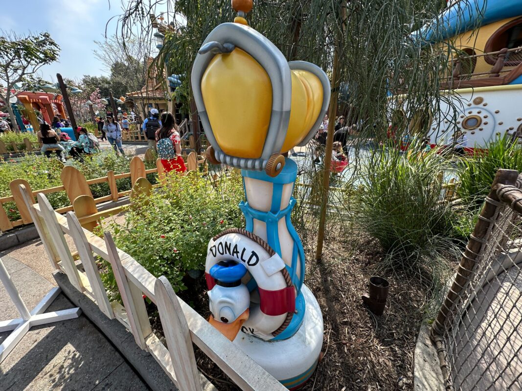 The backstory of Donald’s Duck Pond is that Donald has crashed his boat into the duck pond next to Goofy’s house. The boat was formerly in a pool of water with a waterfall but this feature was filled in to become the play area. Originally, guests were able to enter Donald’s boat, but it closed many years ago and was permanently sealed from guest access during the recent reimagining.
