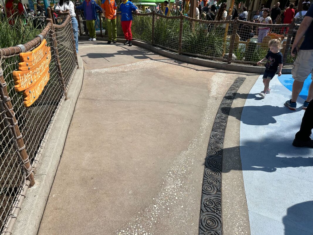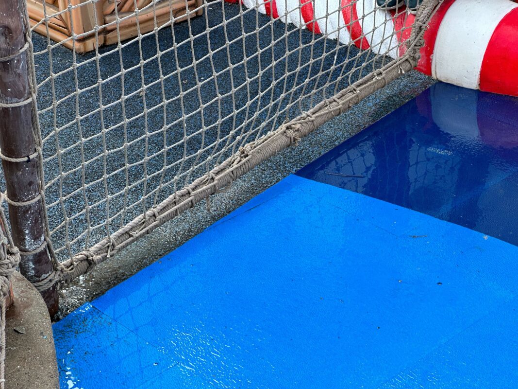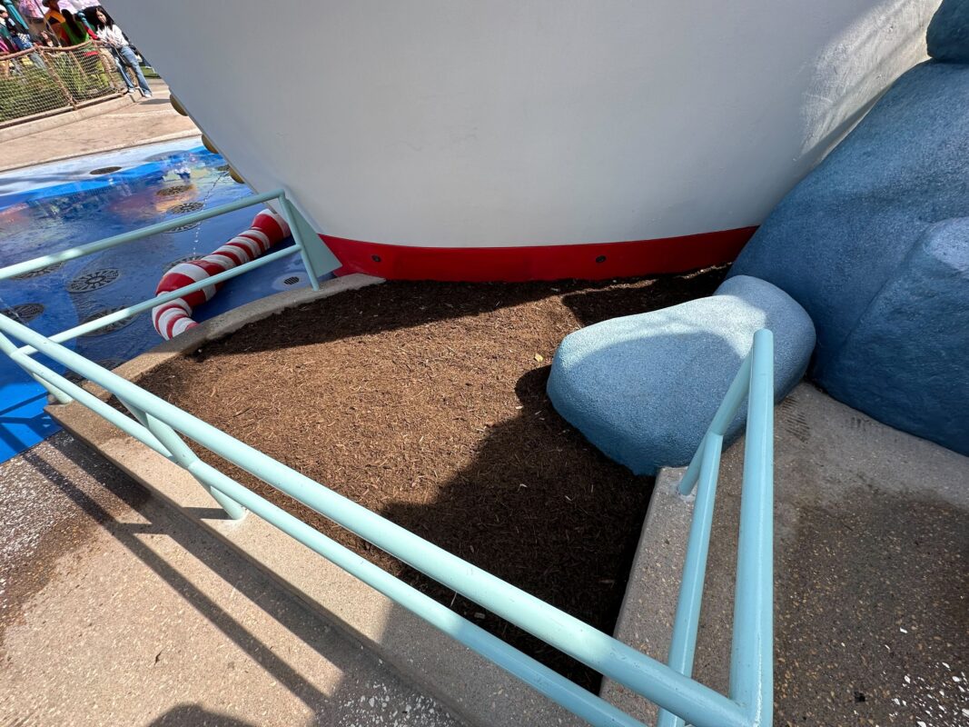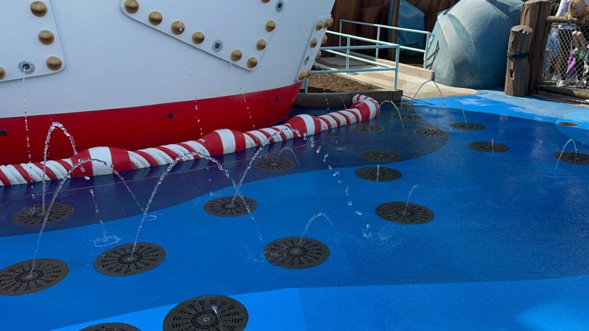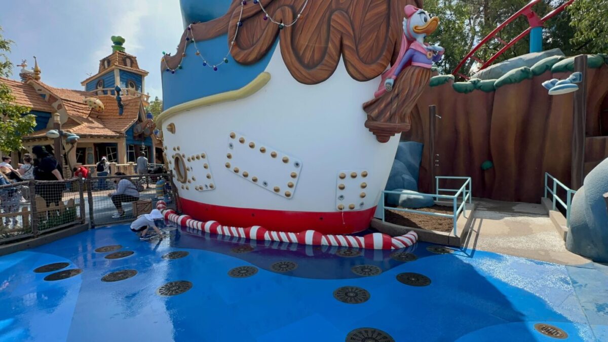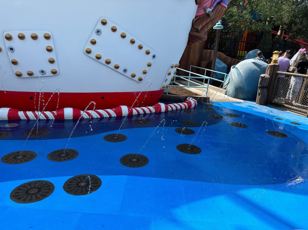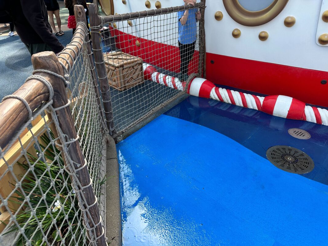 The splash pad is on the right side of Donald’s boat. The left side is a dry play area. A rope fence down the middle separates the two sections.