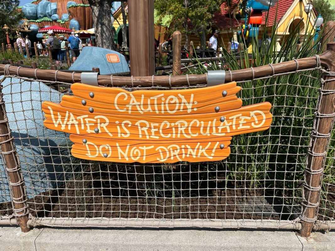 A wooden sign on the fence reads “Caution: Water is recirculated, do not drink!”