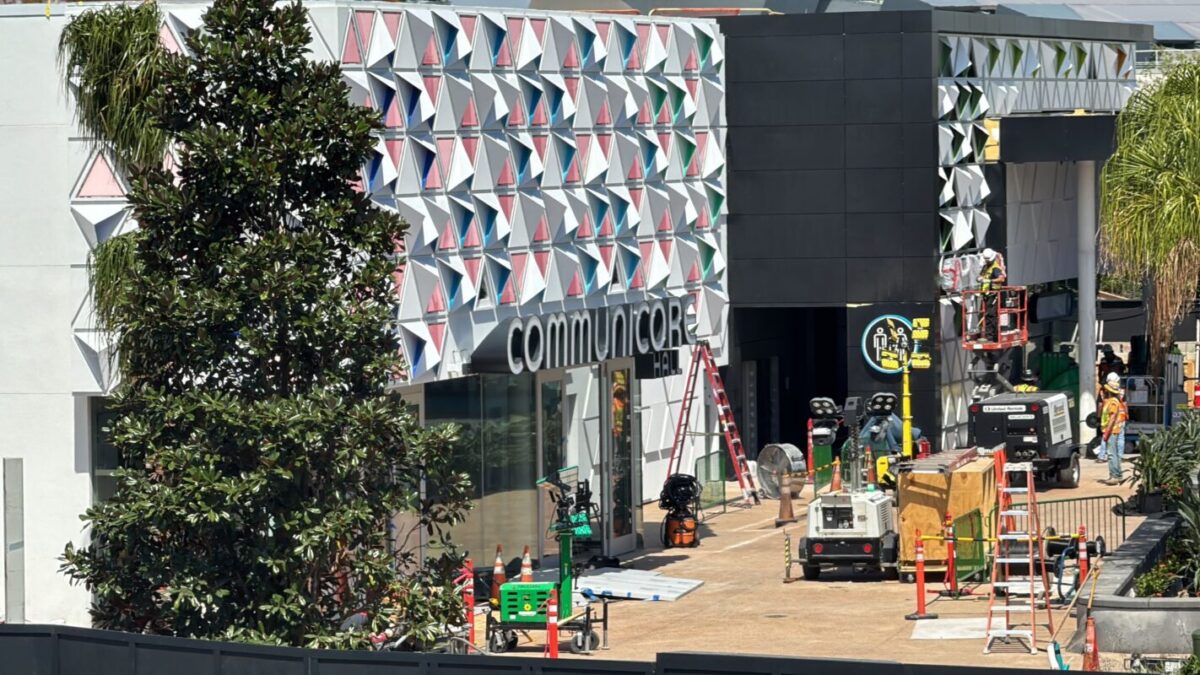 A “CommuniCore Hall” sign has been installed above one of the new EPCOT building’s entrances.