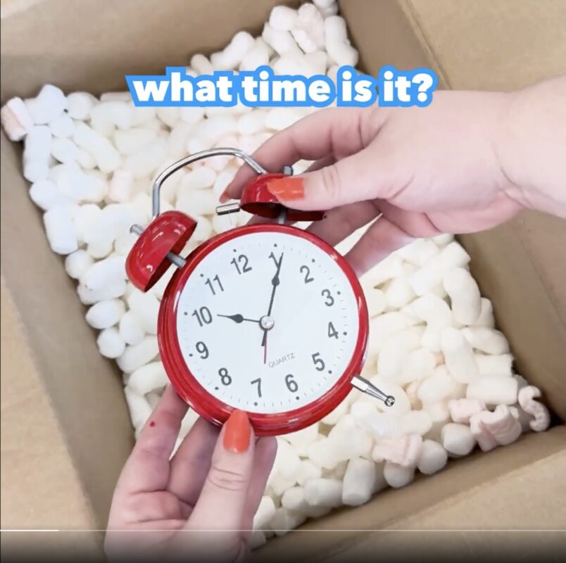 First up is a red clock with the caption, “What time is it?” This is in reference to “Back to the Future,” believed to be part of the classic movies Tribute Store and/or parade.