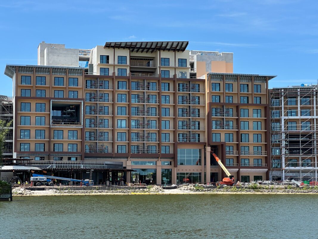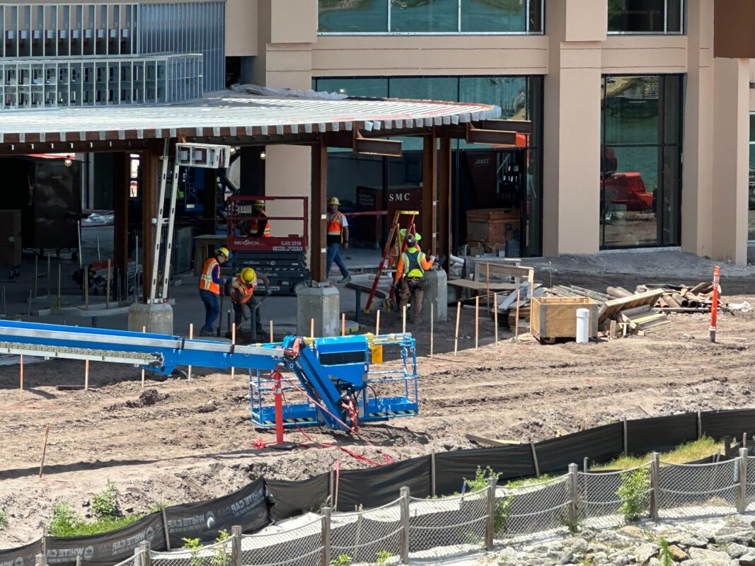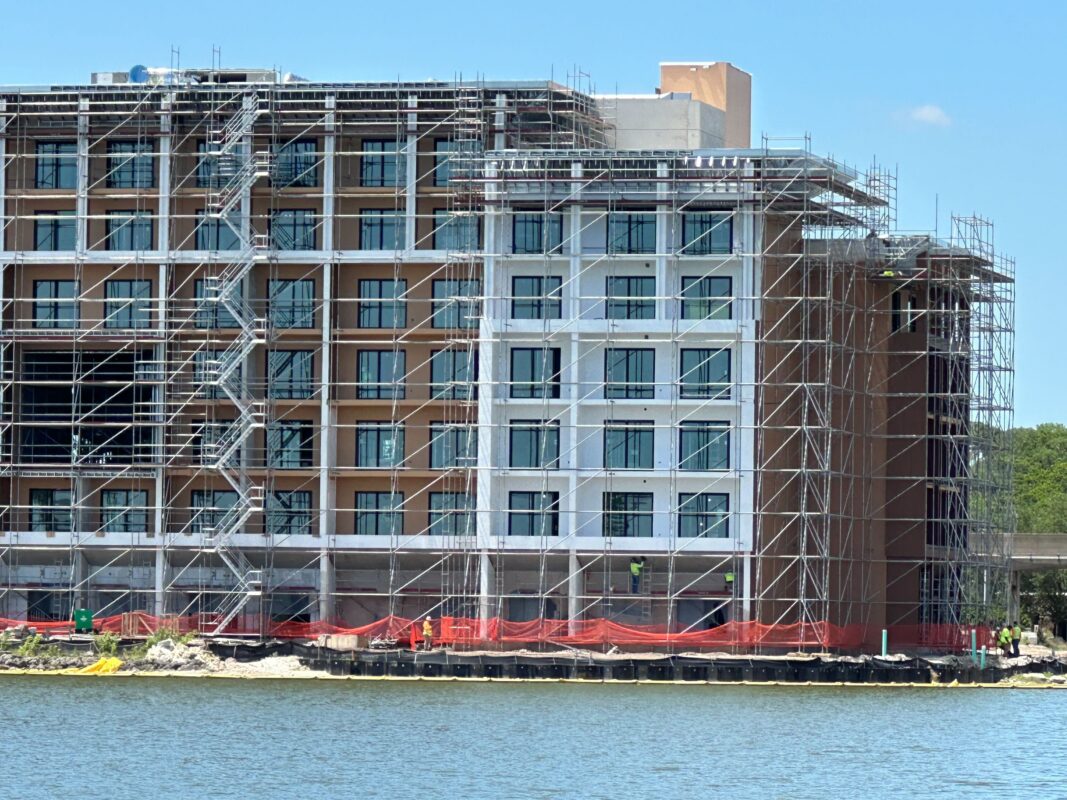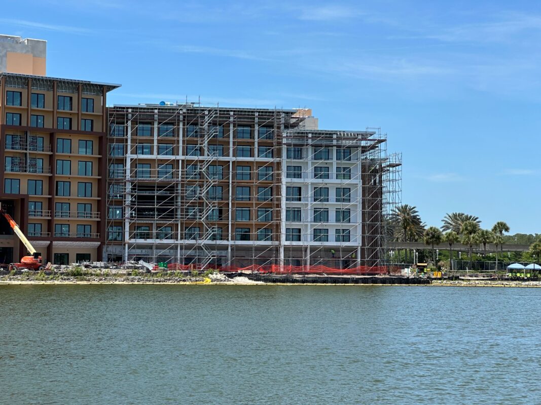 Crews have painted most of the new Disney Vacation Club tower at Disney’s Polynesian Village Resort as construction continues.
