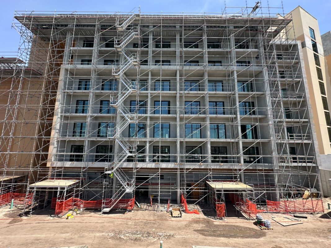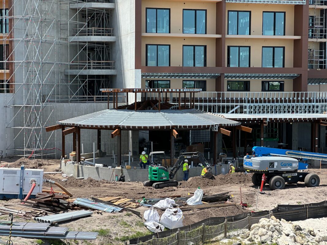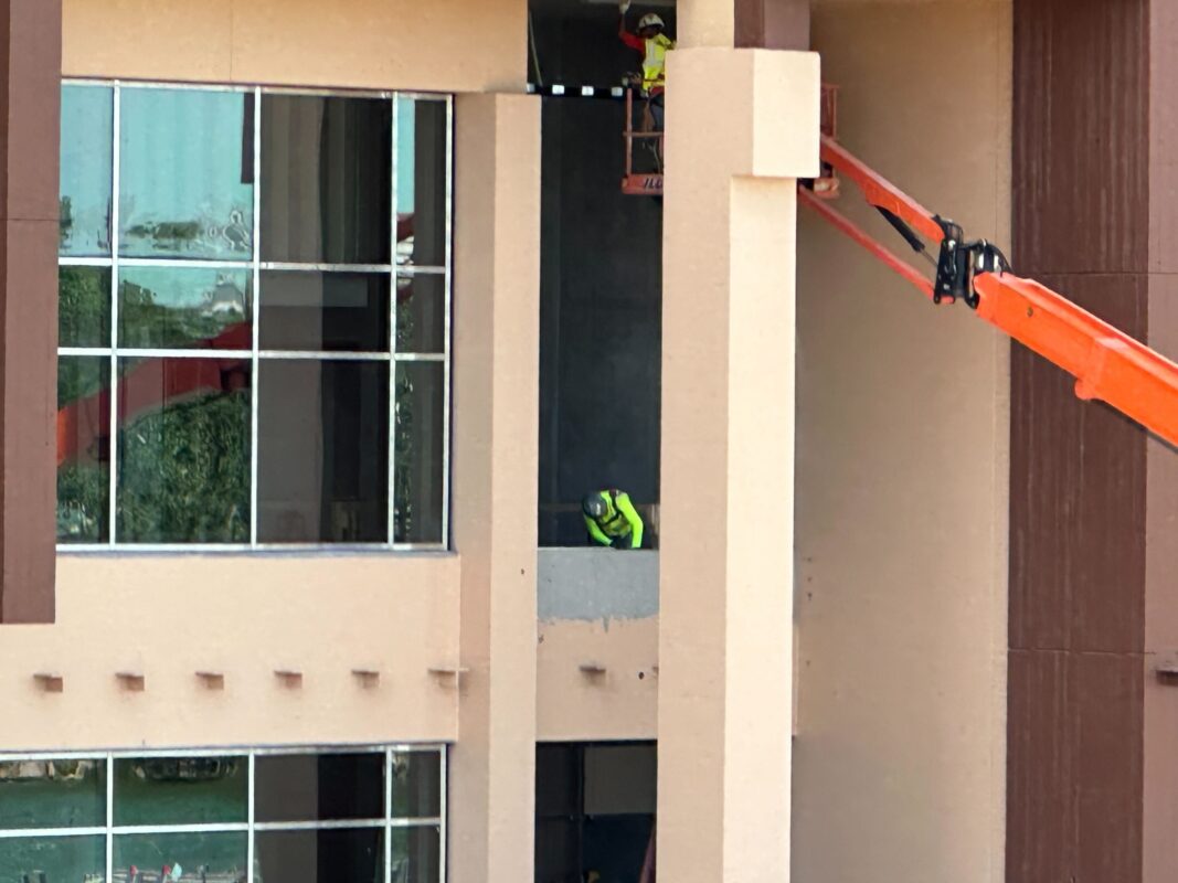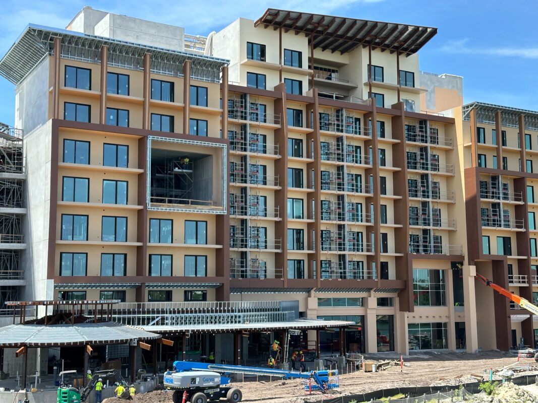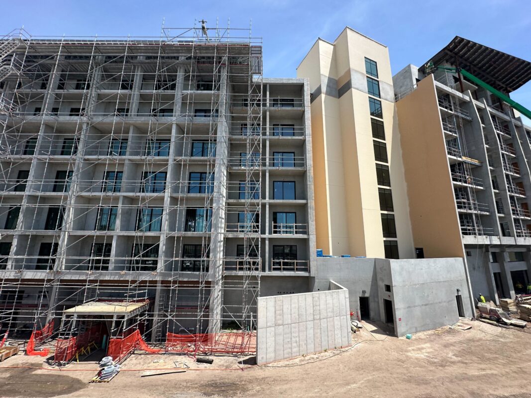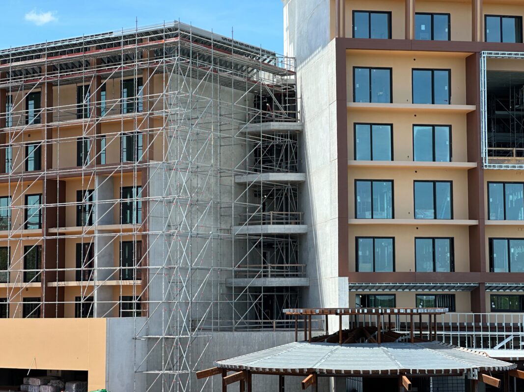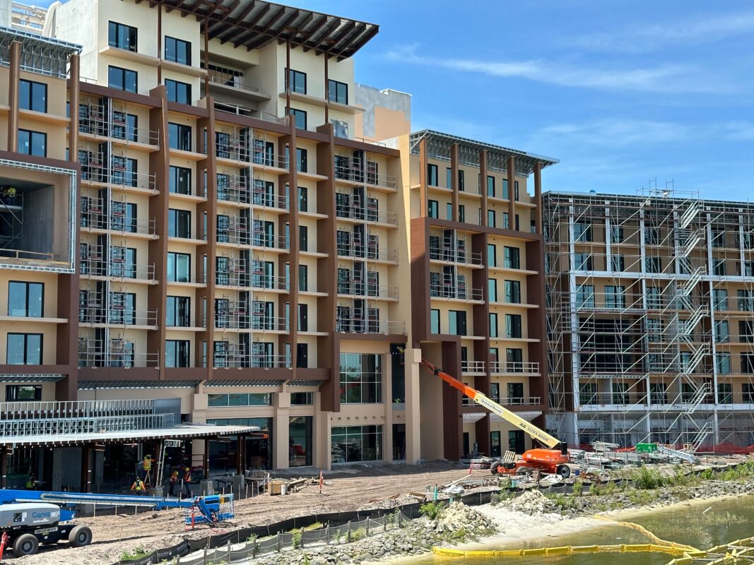 Since our last update, many of the balcony walls facing the lagoon have been painted dark brown. The base color is a lighter shade of orange-tan. The white sections on the right wing are primer for future color.