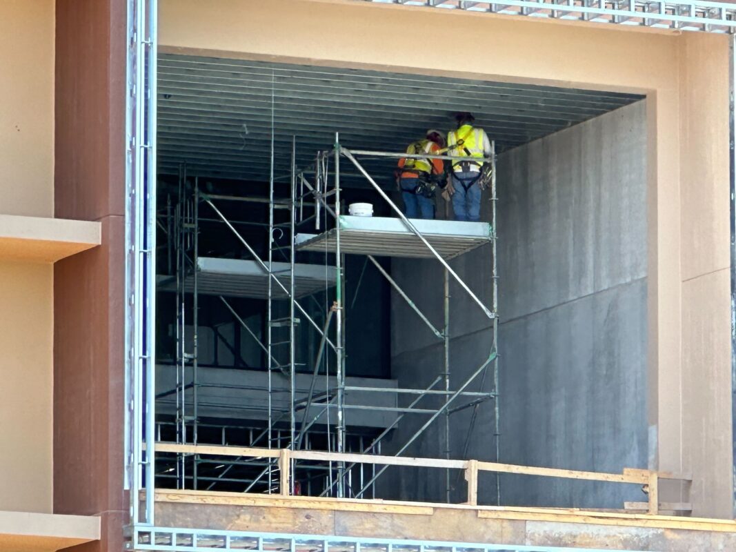 The walls inside are unpainted. The crew members were atop scaffolding filling the space.