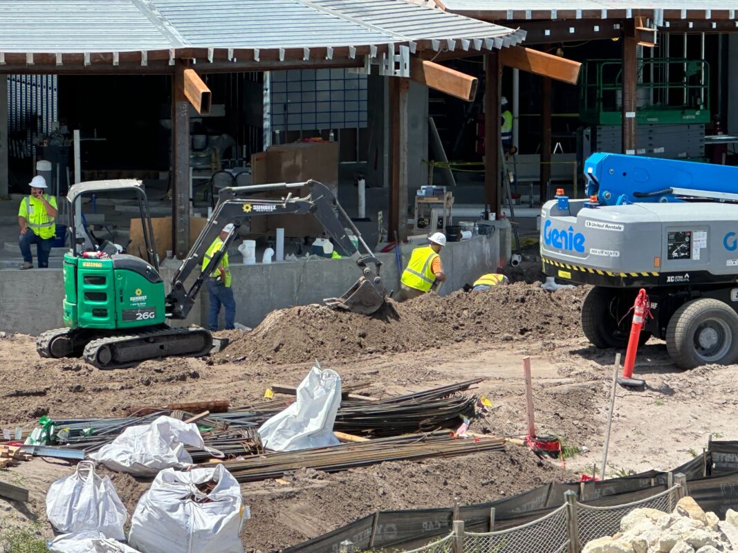 More crew members were working on the concrete at the other end of the restaurant. A future wall is outlined with wooden sticks in the ground.