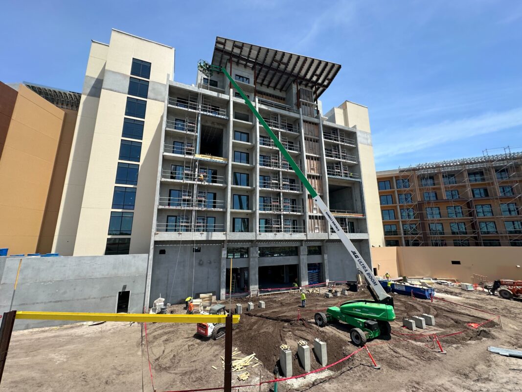 Metal overhangs line the top of the DVC tower. These will eventually be covered in paneling.