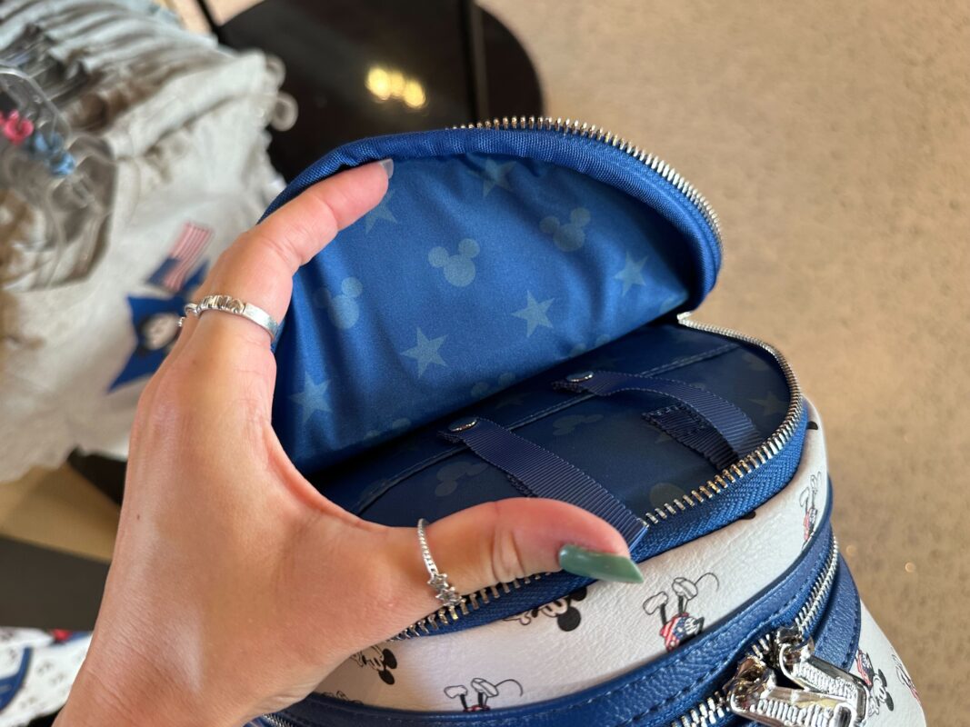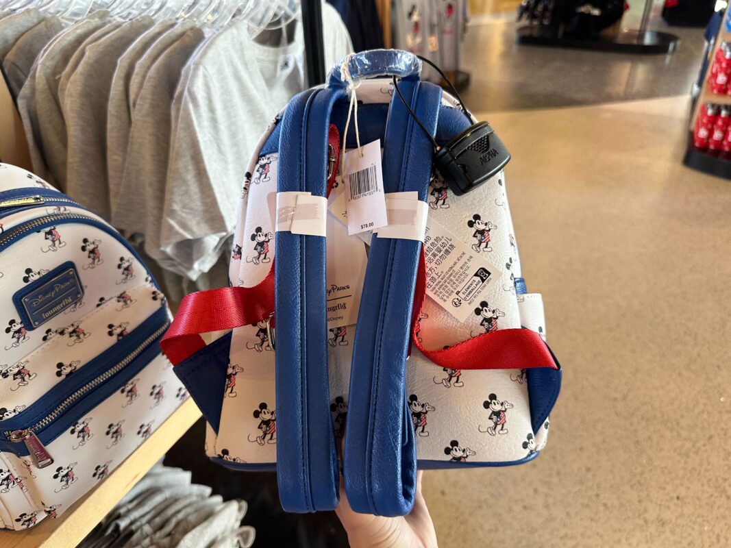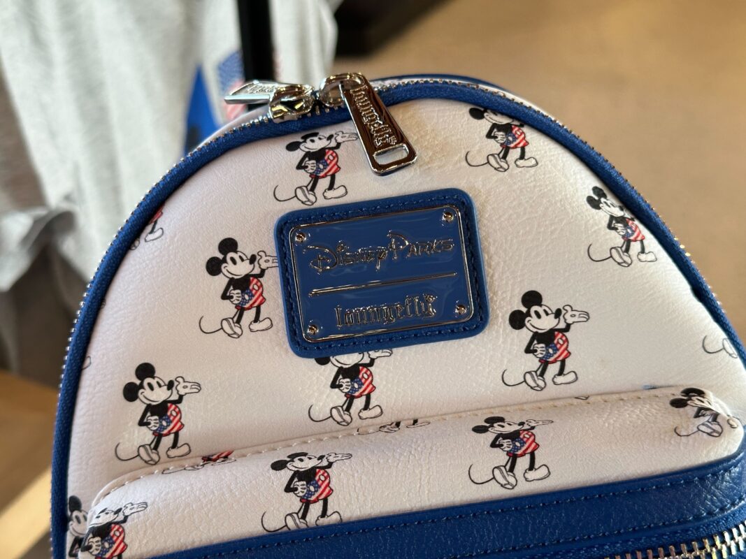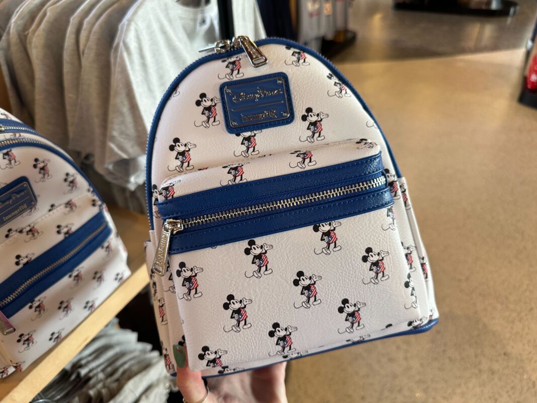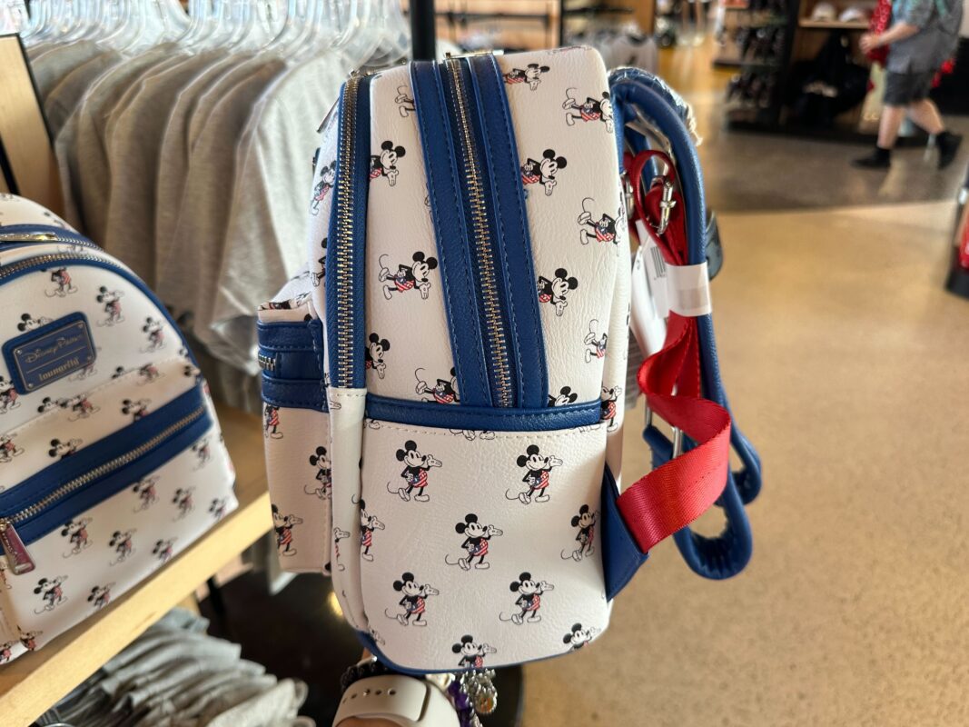 In Creations Shop at EPCOT, we spotted the matching mini backpack, which is white with blue trim. It features the same all-over pattern with Mickey in patriotic shorts.