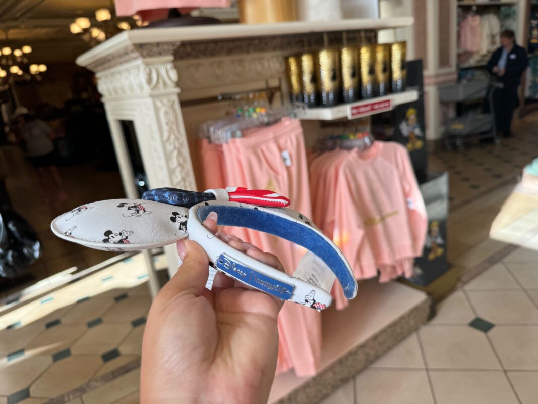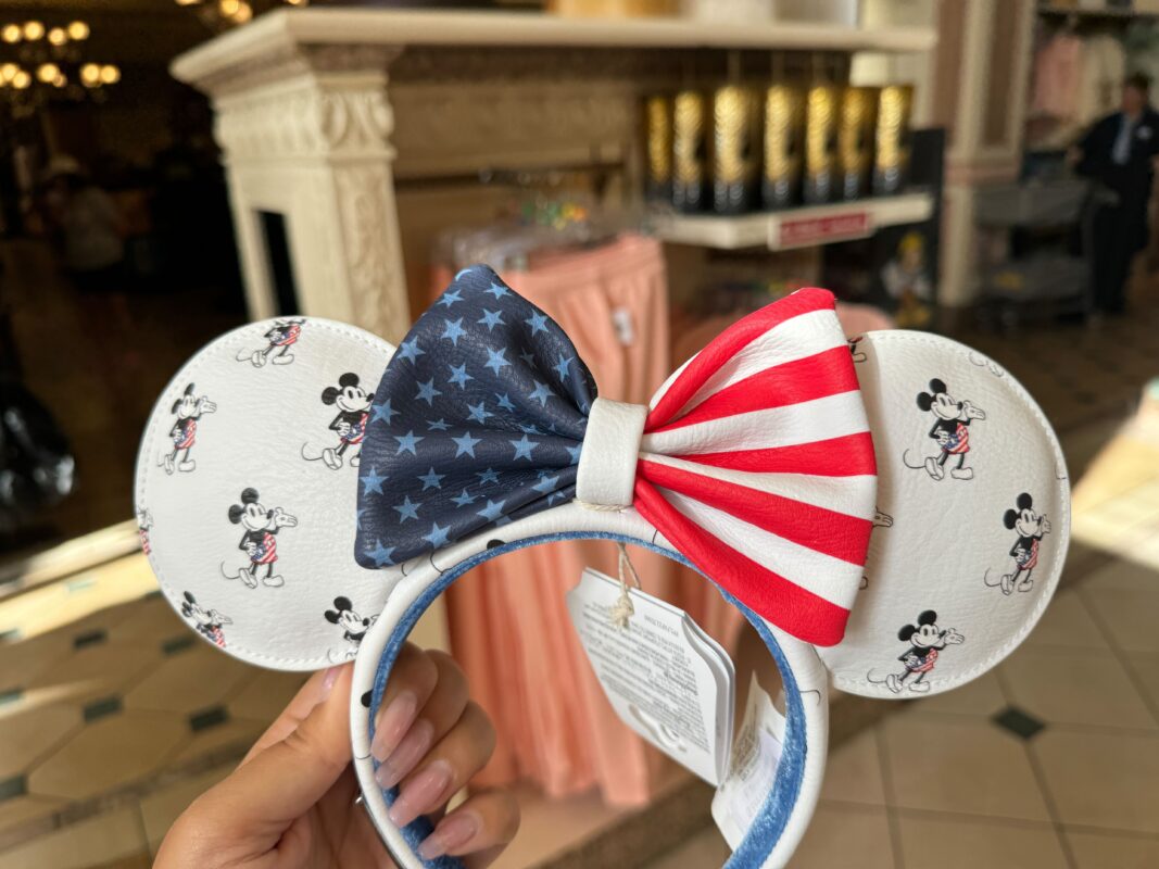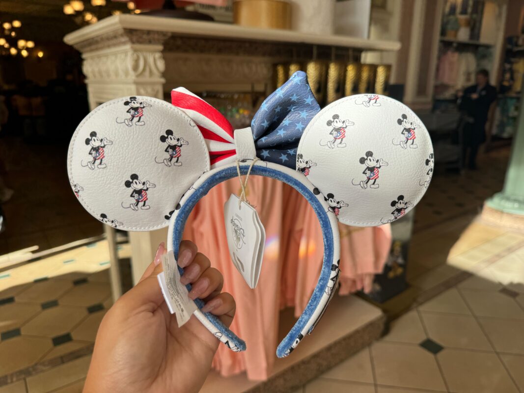 The accessory is mostly made of pleather, with blue velour lining the headband. The outside of the headband and the ears are white. They’re patterned with small images of Mickey wearing American flag shorts.