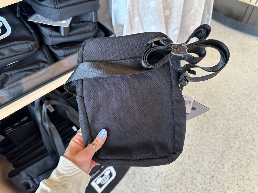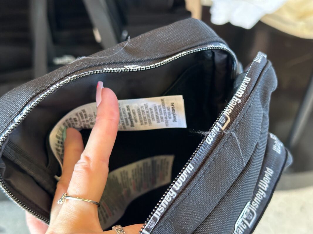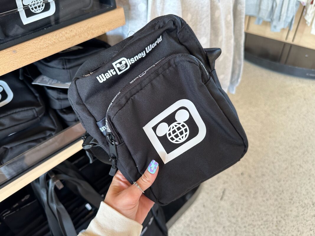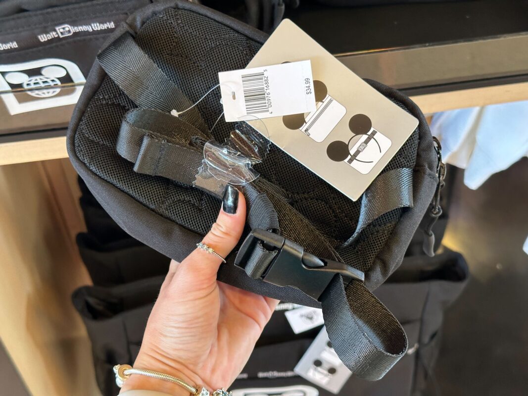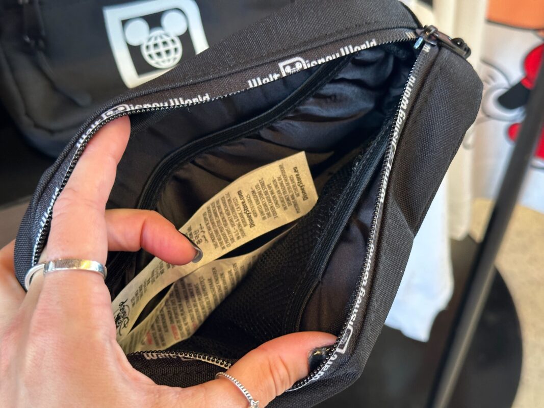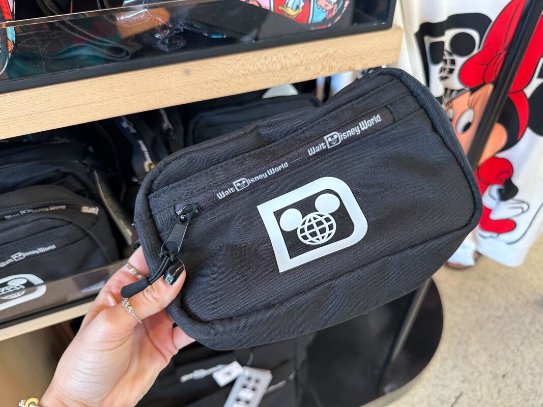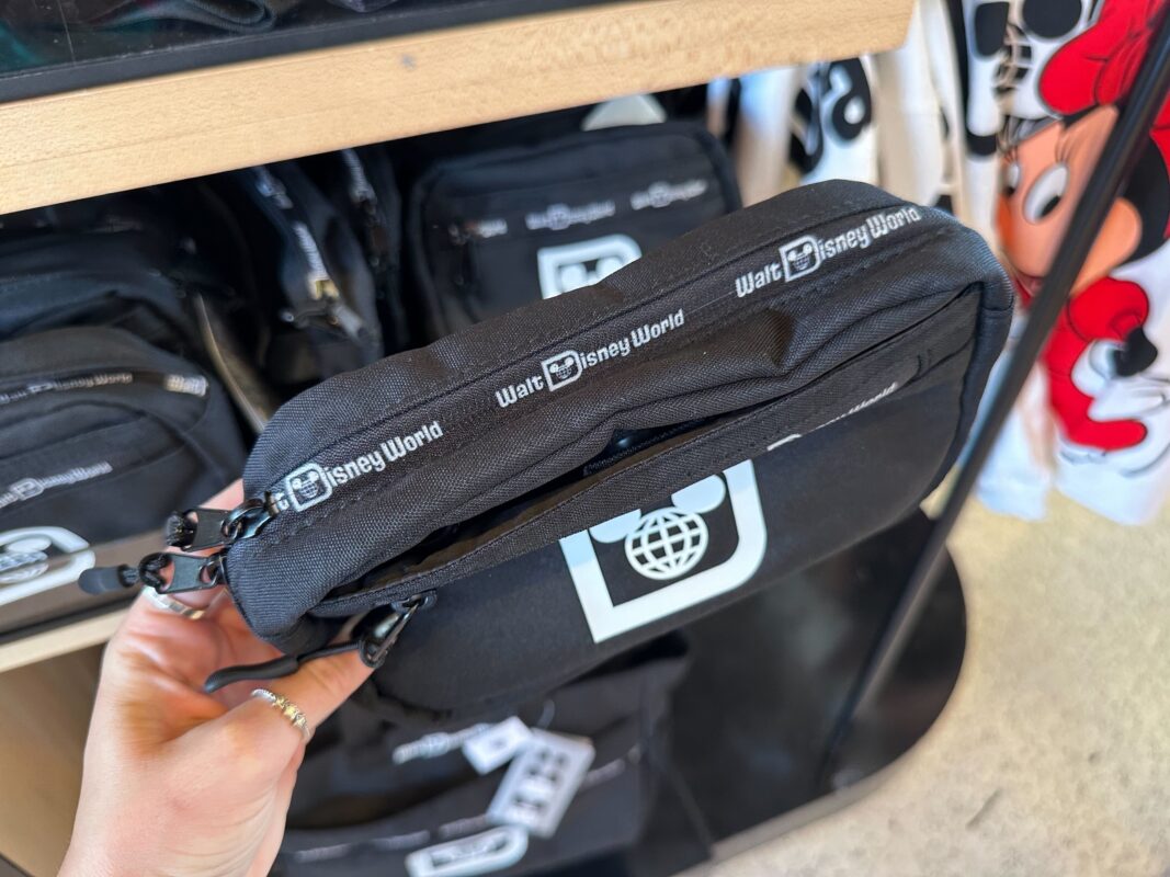 The belt bag has a similar design. There’s a small zip-up pocket in front of the ear headband slip pocket. The logo is on the front and “Walt Disney World” is across the zippers.