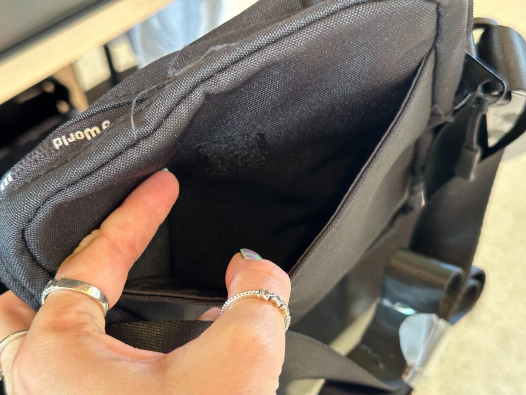 There’s a small slip pocket with a Velcro square on the back.