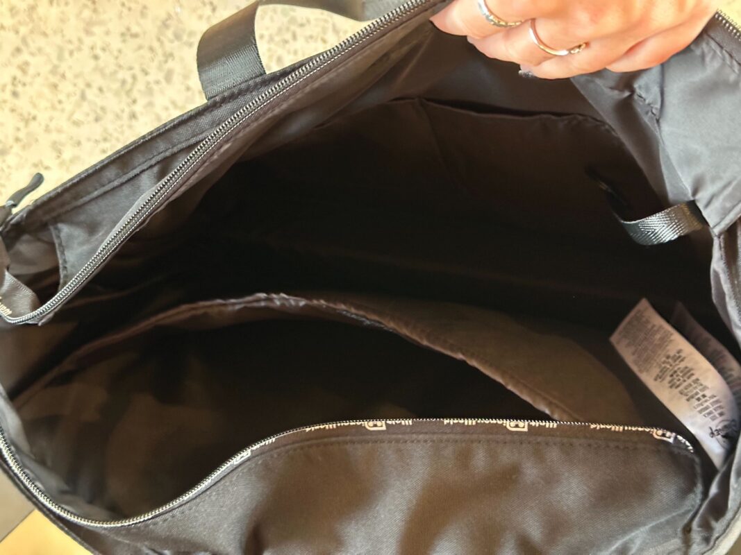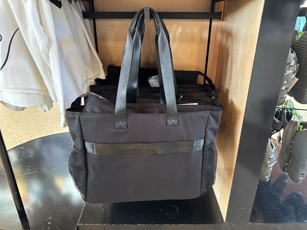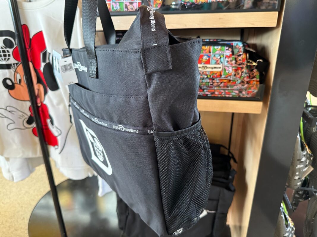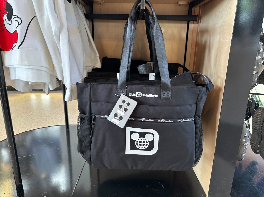 The larger ear holder bag is a tote with the Mickey globe “D” logo on the front. “Walt Disney World” runs along the zippers of the small front pocket and main pocket. The wordmark is also printed by the handle.