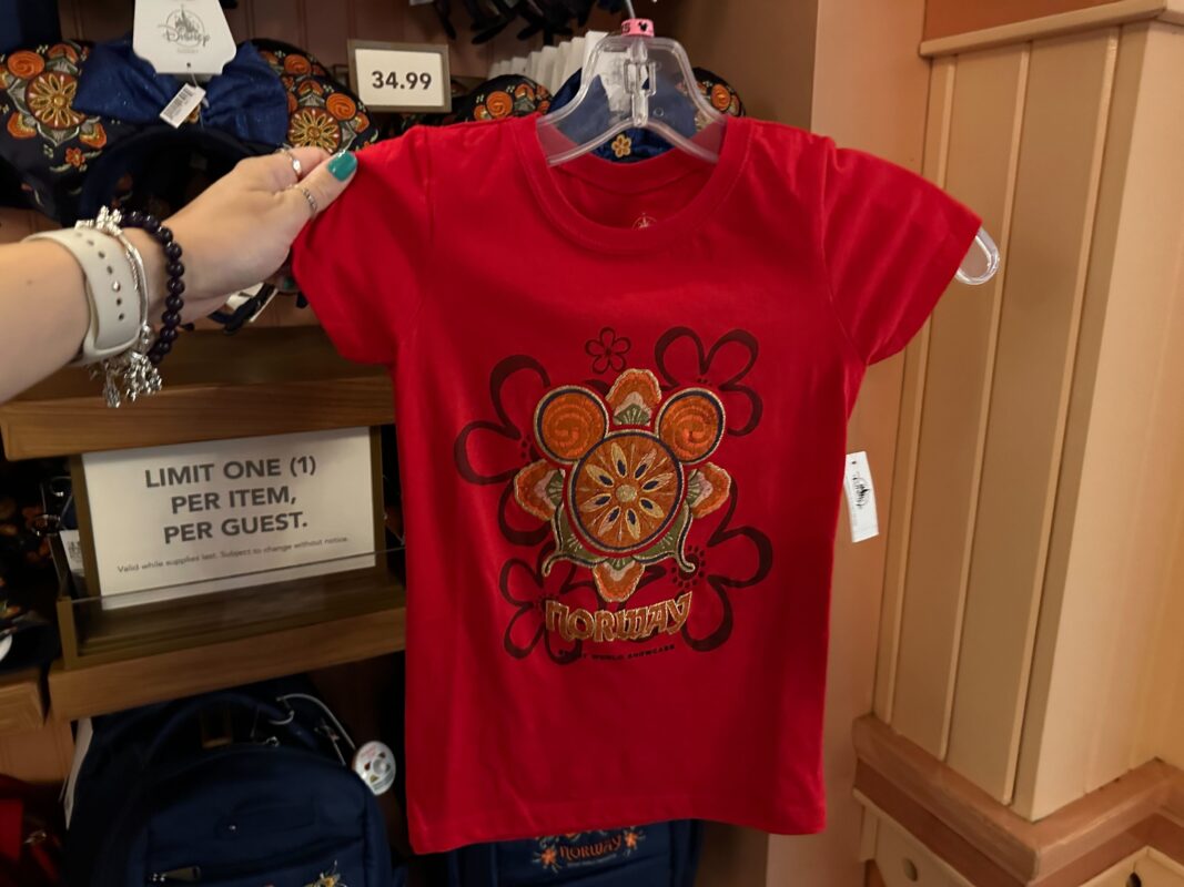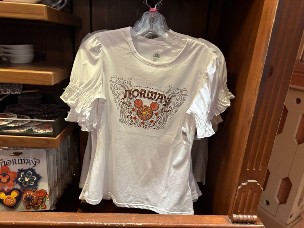 We also spotted this adult women’s cut shirt with gathered and ruffled sleeves. The Norway floral graphic seen on other merchandise in this collection is present on the front.