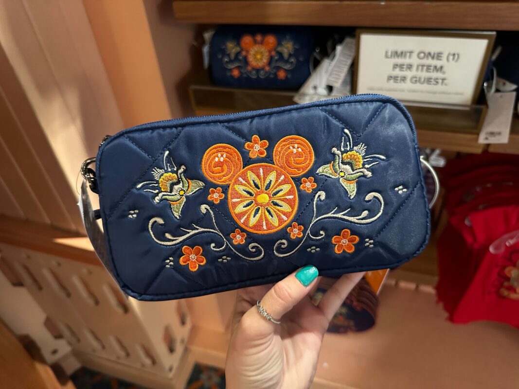 The merchandise has a dark blue color scheme with floral orange embroidery. The Lug belt bag has this embroidery against a quilted stitching pattern. An orange Mickey head is in the center of the design.