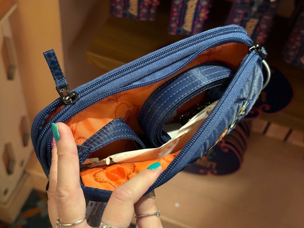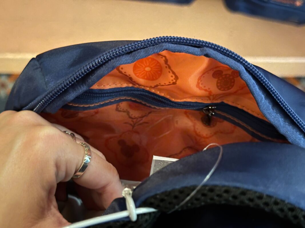 It includes an adjustable strap to turn it into a crossbody or to wear as a belt bag. It has two zip pockets, both with orange interior lining featuring a pattern matching the embroidery.