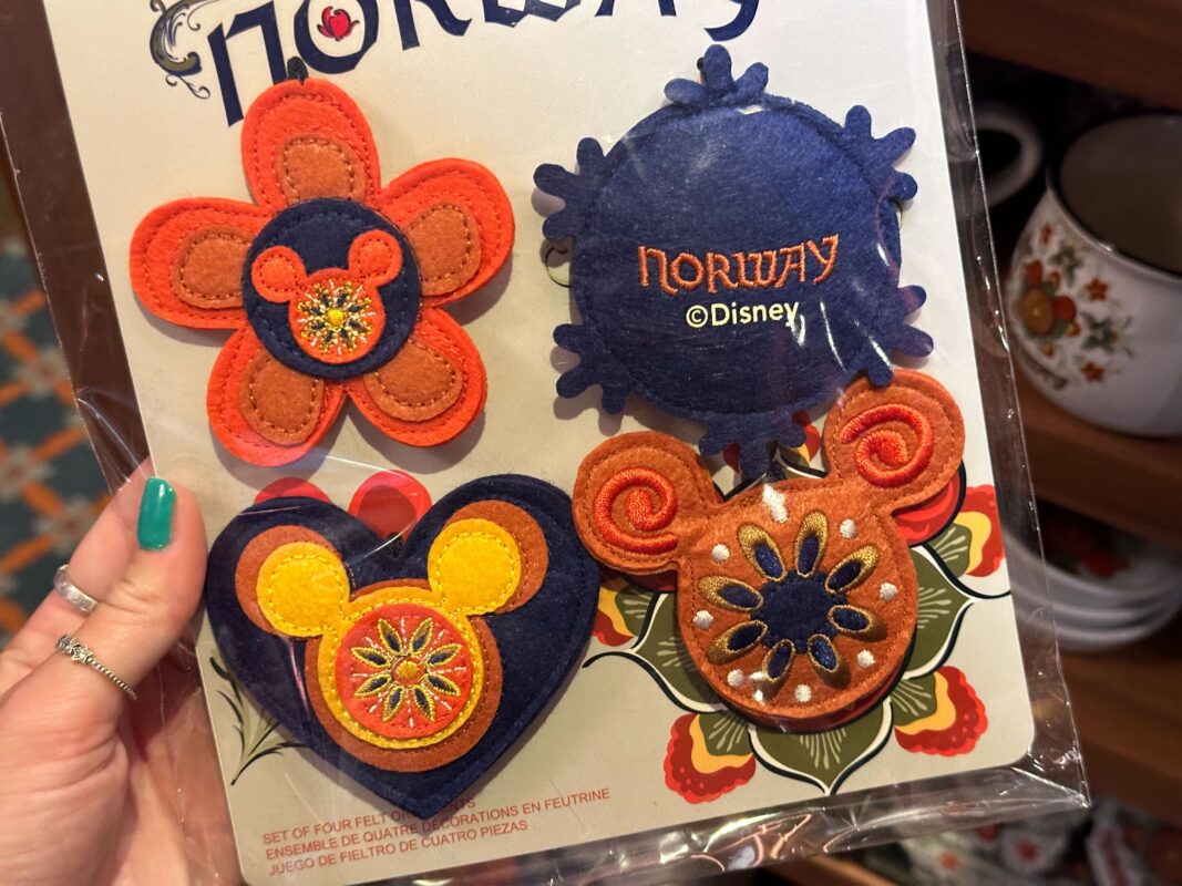 Another ornament is a solid blue snowflake with “Norway” embroidered in orange. The Disney copyright symbol is printed in white.