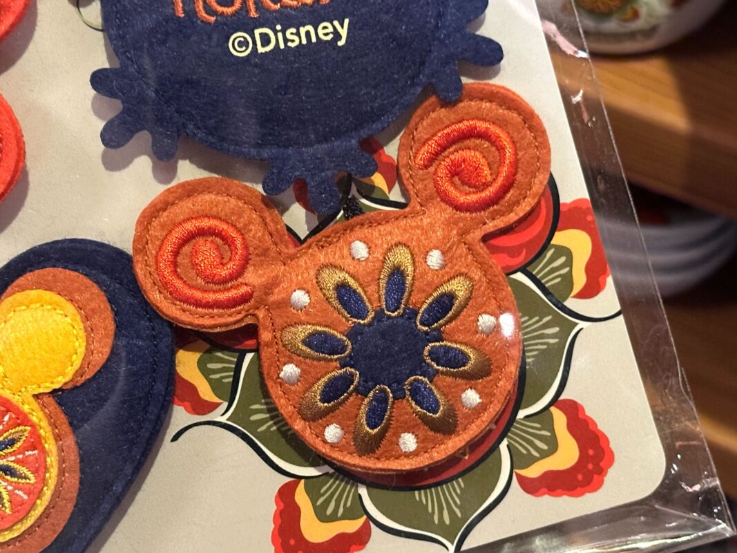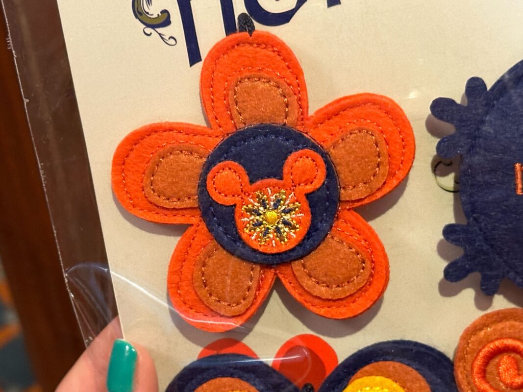 The first ornament is a double-layered orange flower. The center is blue with an orange Mickey head on top. The Mickey head features gold and blue embroidery.