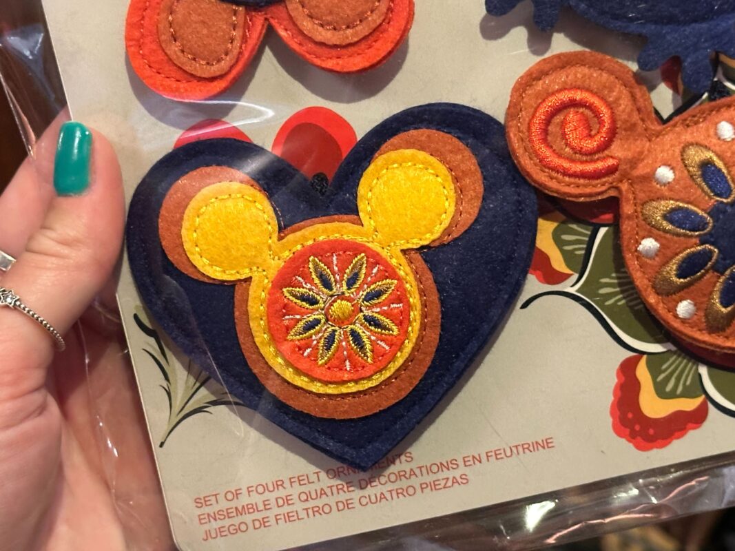 A blue heart-shaped ornament has an orange and yellow layered Mickey head in the center. An orange circle in the middle features similar embroidery to the other ornaments.