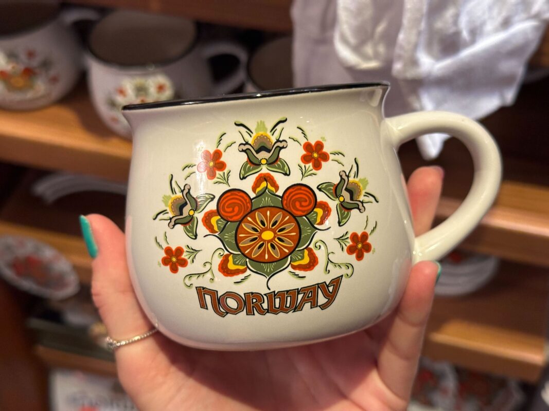 This mug is white with an orange, yellow, and green design on one side. The design is similar to the embroidery on other products. “Norway” is at the bottom.