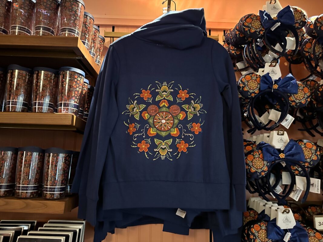 The hoodie is navy blue with a zipper and two front pockets. A Nordic Mickey head is on the left breast with “EPCOT World Showcase” and “Norway.”