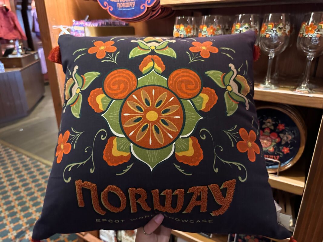 A decorative pillow with "Norway" and "Epcot World Showcase" stitched on it, featuring a floral pattern in the center. Perfect for adding a touch of Scandinavian charm to your home decor or as a unique travel lug keepsake.