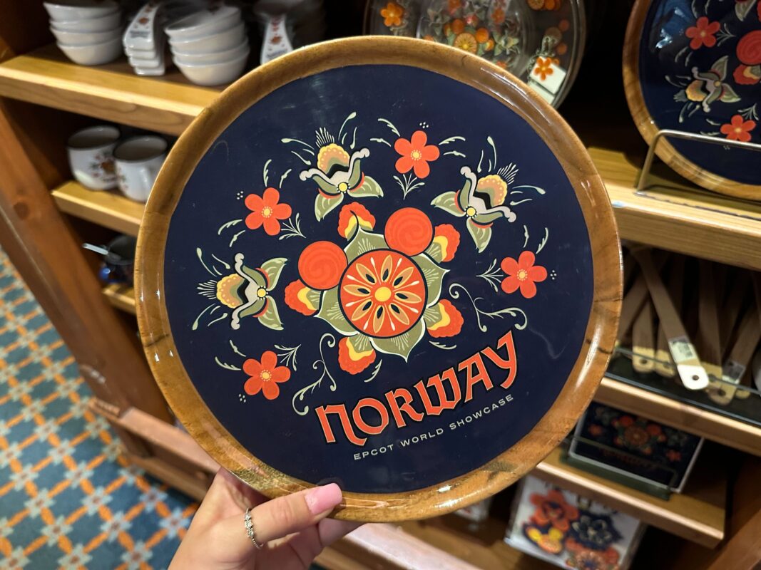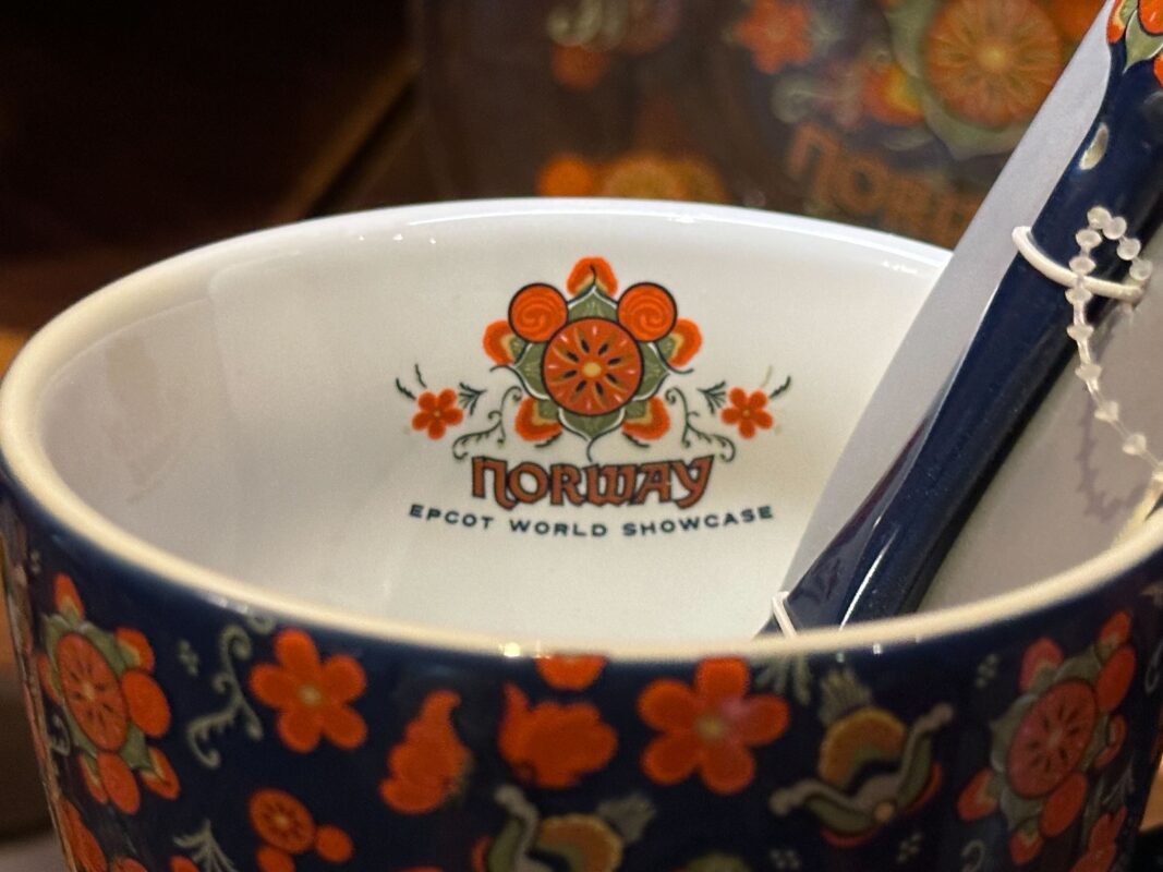 Close-up of a decorative bowl with floral patterns and the words "NORWAY EPCOT WORLD SHOWCASE" printed on the inside. Other similarly decorated items appear blurred in the background, revealing a glimpse of traditional Norwegian craftsmanship that you'll want to lug home.