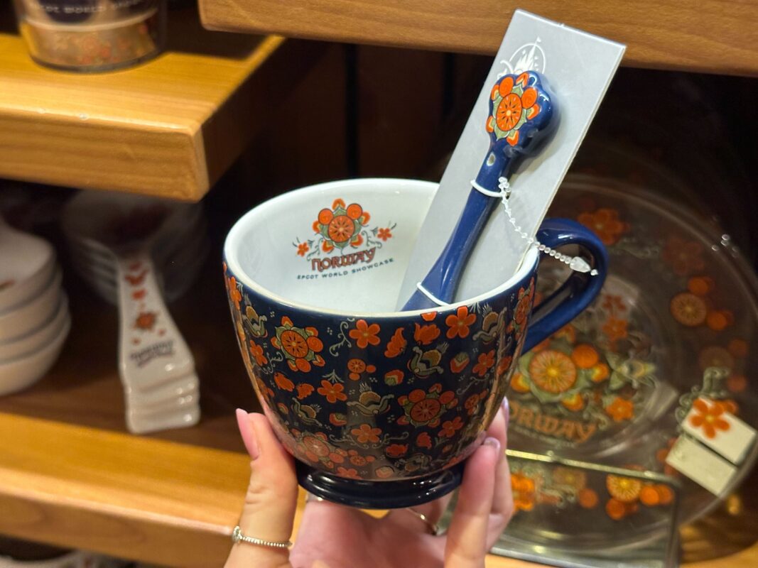 A person holds a dark blue mug with an intricate orange floral design they found in Norway. Inside the mug is a matching spoon with a cutout floral design on the handle.