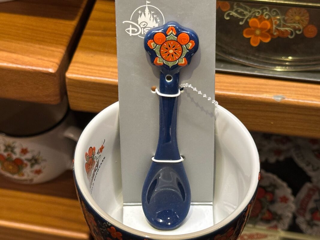 A decorative blue spoon with a floral design and Disney branding is displayed on a card. The spoon is standing in a floral-printed cup, evoking the charm of Norway, with similar themed items in the background.