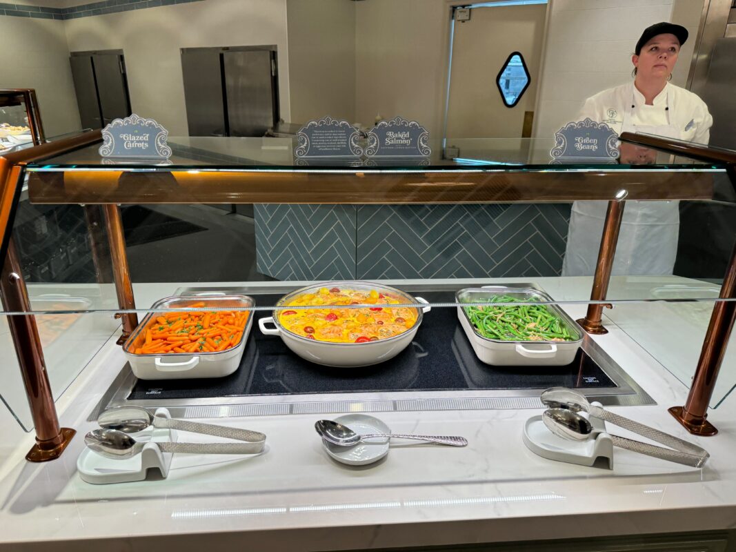 The other item at the carving station was porchetta. We can’t recall seeing porchetta on any Disney menu, let alone at a buffet. At first, we were excited about something very different, but our excitement soon turned to disappointment as soon as we tasted the first piece. It was rather dry and overcooked, and the crispy skin was so overdone that it was basically inedible.