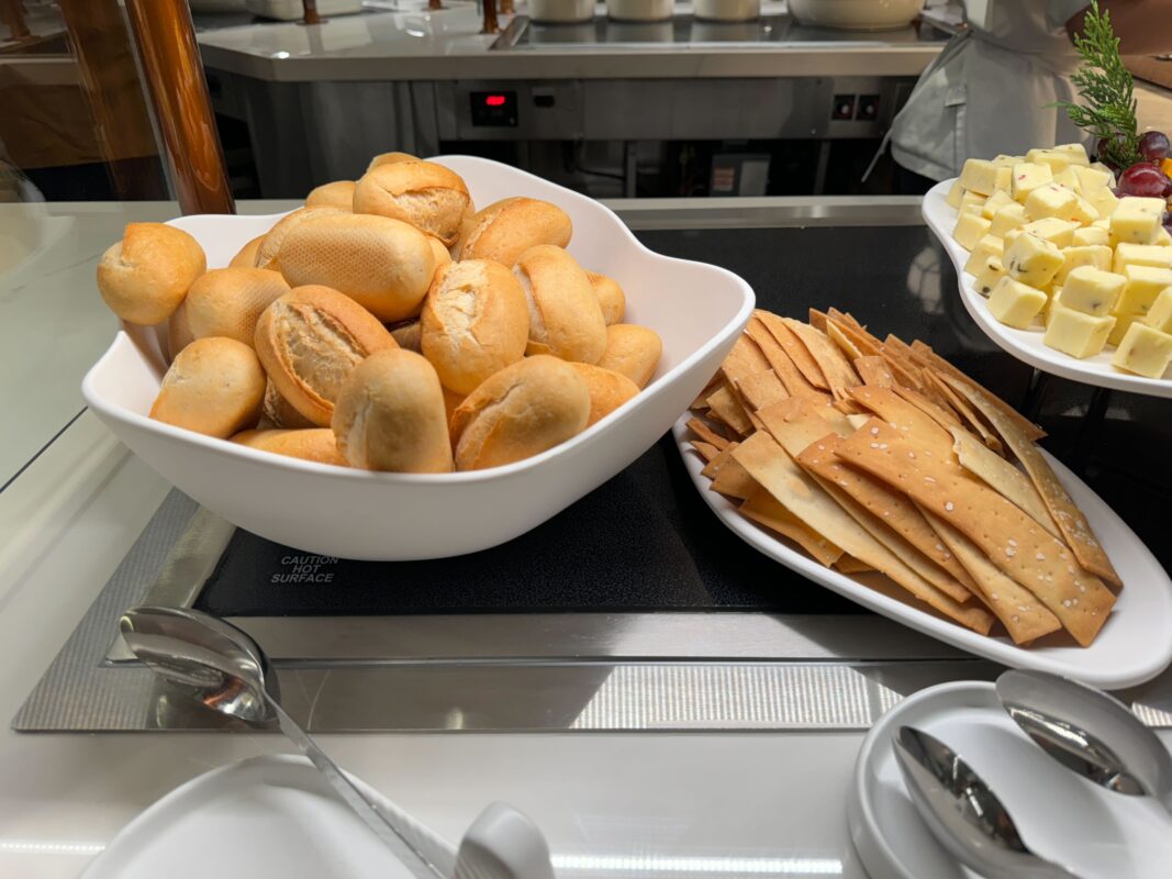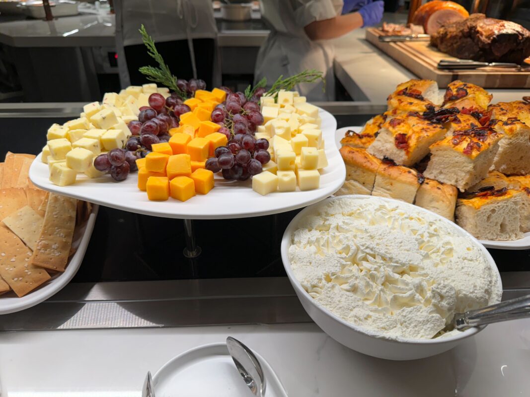 There are French rolls and assorted crackers, accompanied by assorted cheeses and whipped butter. These are all standard offerings and nothing to write home about.