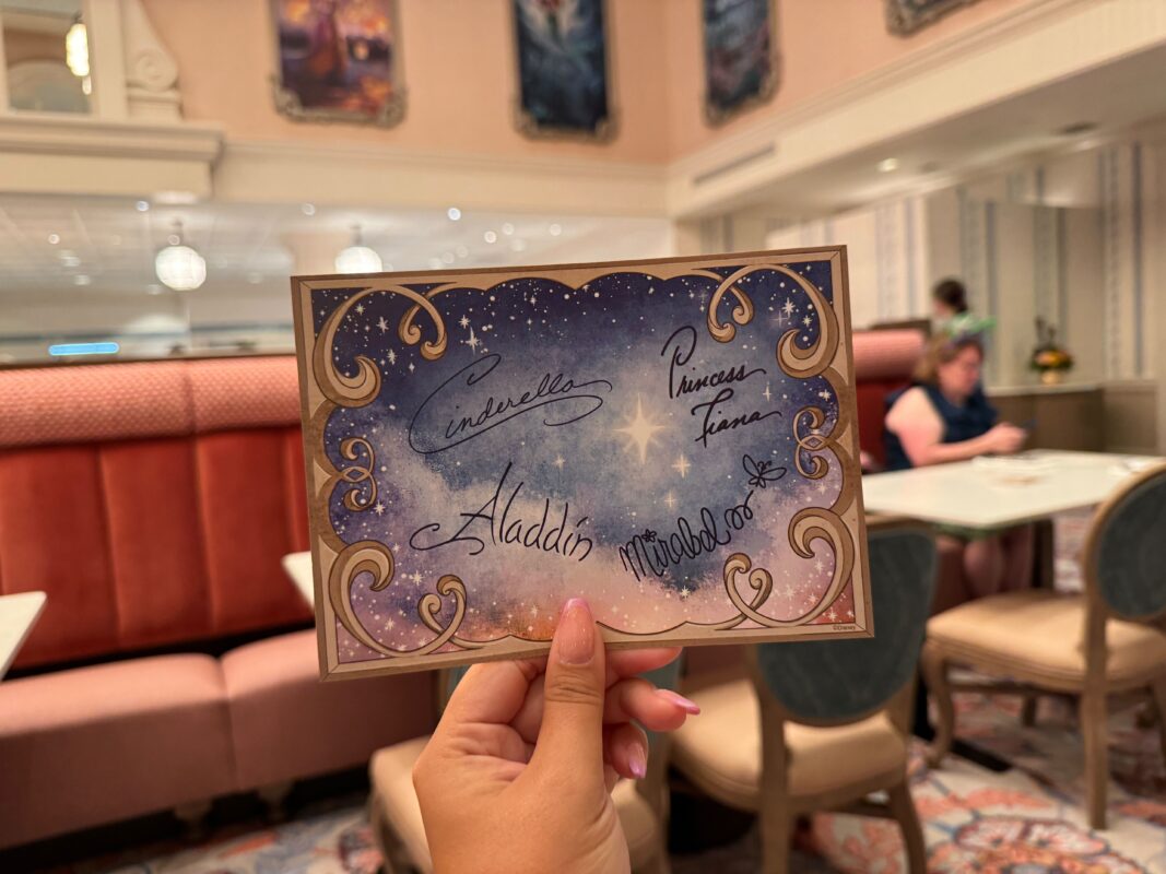 Guests get the same autograph card and meet the same characters at breakfast and dinner. The front of the card features Cinderella’s glass slipper, Tiana’s lilypad tiara, the Genie’s magic lamp from “Aladdin,” and the magic candle and butterflies from “Encanto.”